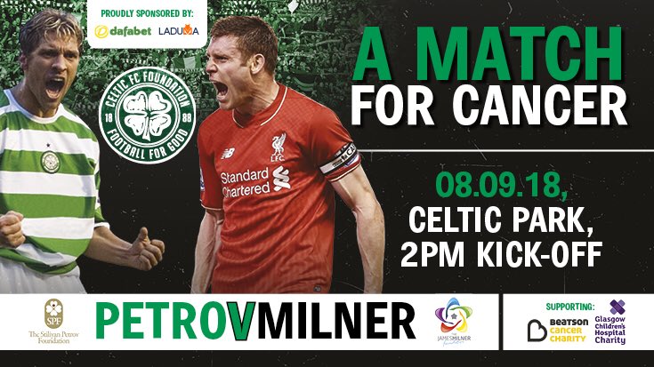 We’re so grateful to our supporters at @CelticFC & @SPFoundation19! Soon to come, A Match for Cancer will see @StanPetrov19 and @JamesMilner go head to head with a host of special guests from football & entertainment. Kick off:8th Sept(2pm)Tickets⚽️➡️ https://t.co/Kq9OY47bdF pic.twitter.com/fZxIn5xh7w