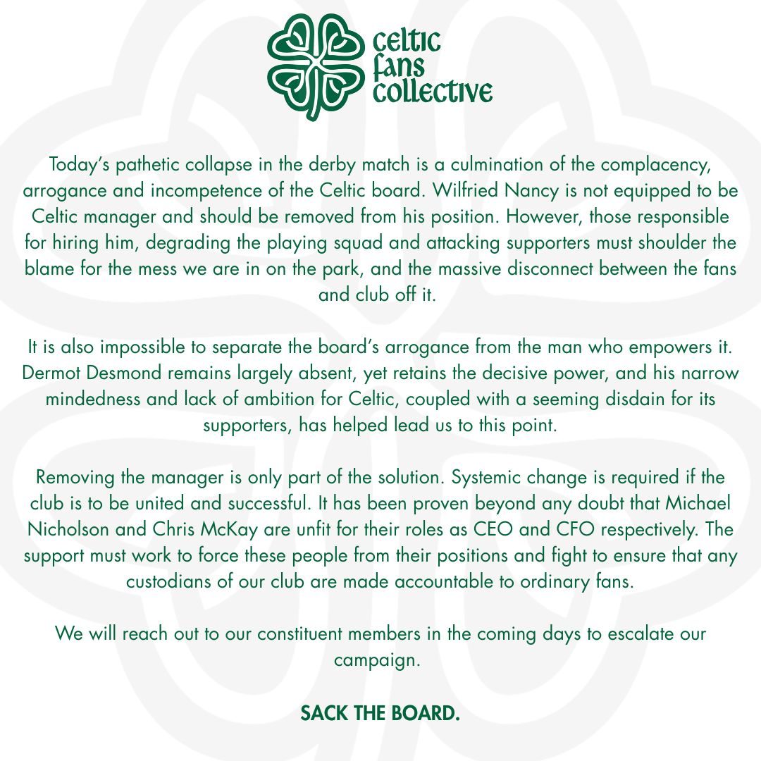 “Wilfried Nancy is not equipped to be Celtic manager and should be removed from his position. However, those responsible for hiring him, degrading the playing squad and attacking supporters must shoulder the blame for the mess we are in on the park, and the massive disconnect between the fans and club off it.