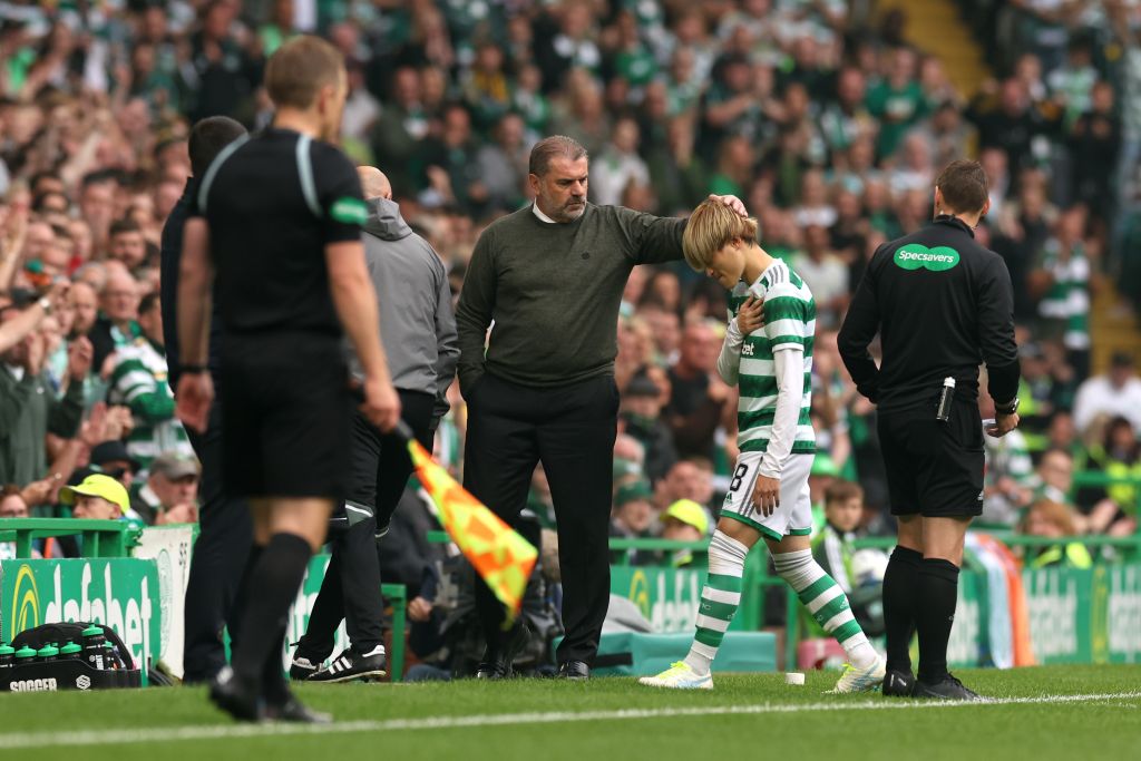 : Kyogo Furuhashi is substituted and consoled by Angelos Postecoglou, Manager of Celtic during the Cinch Scottish Premiership match between Celtic FC and Rangers FC at on September 03, 2022 in Glasgow, Scotland. (Photo by Ian MacNicol/Getty Images)