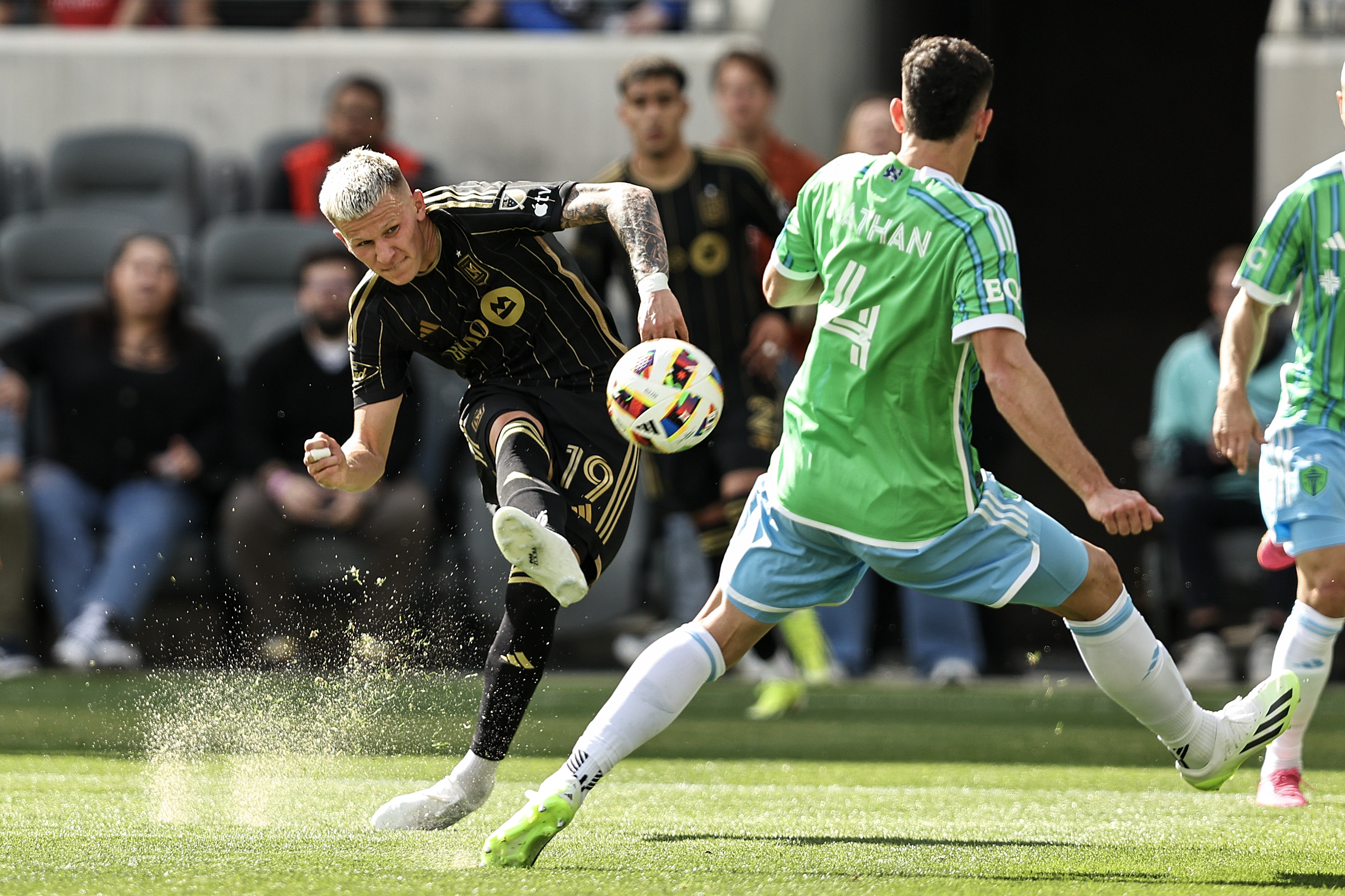 Mateusz Bogusz of Los Angeles FC takes a shot on goal against Nathan of Seattle Sounders at BMO Stadium on February 24, 2024 in Los Angeles, California. (Photo by Michael Owens/Getty Images)