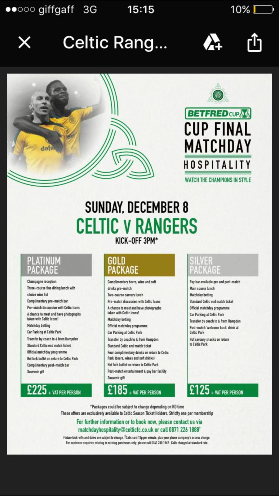 Then there’s the Silver Package corporate Bhoys and Ghirls who might not bother with a banner and will have to buy their own drinks, but have paid ‘just’ £125 for their ticket to see Celtic play the Rangers for the first time ever in a Cup Final.