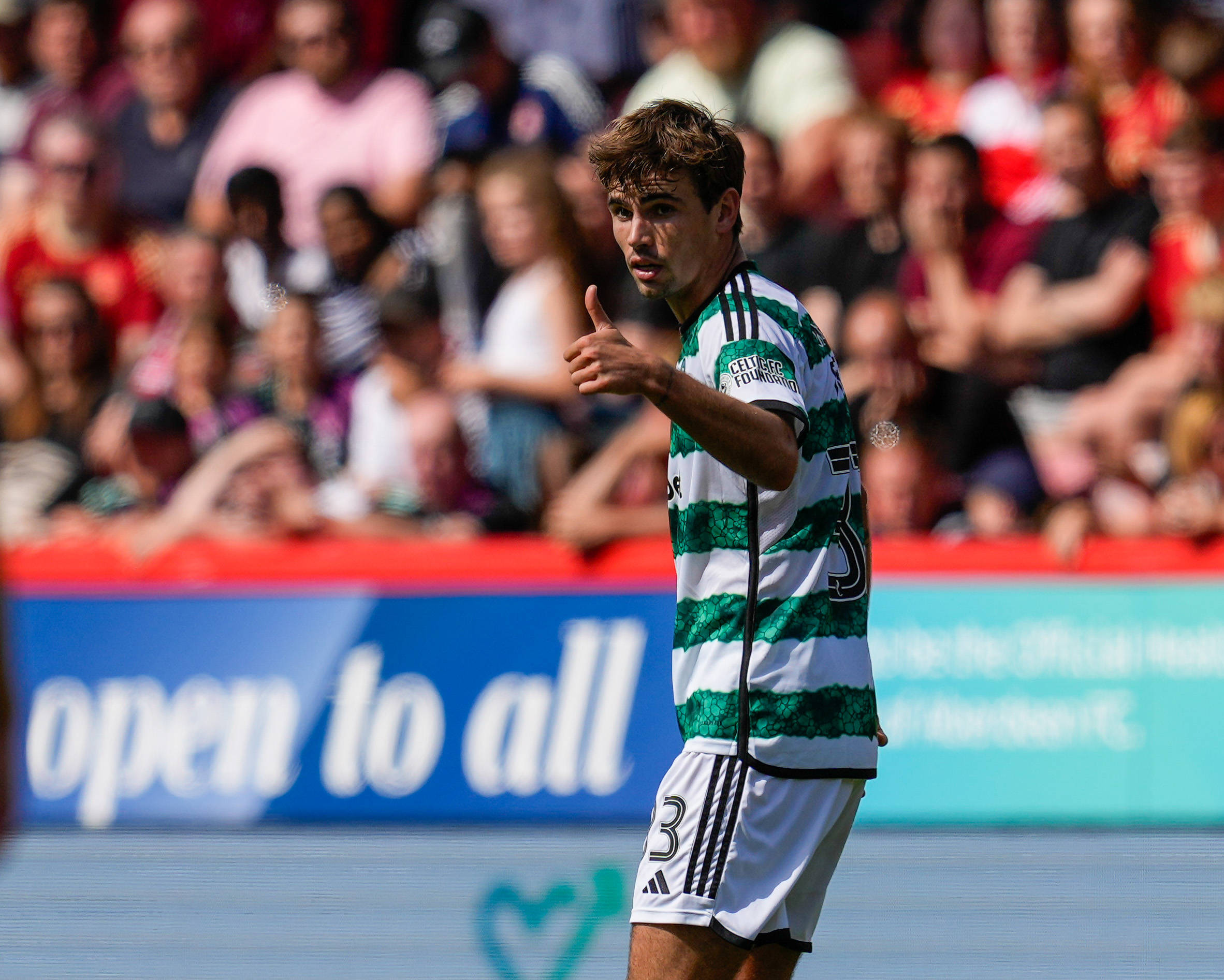 Matt O Riley of Celtic celebrates scoring to give Celtic a 1-3 lead. Aberdeen v Celtic, Cinch Scottish Premiership, Football, Pittodrie 13 August 2023 Photo Stuart Wallace/Shutterstock