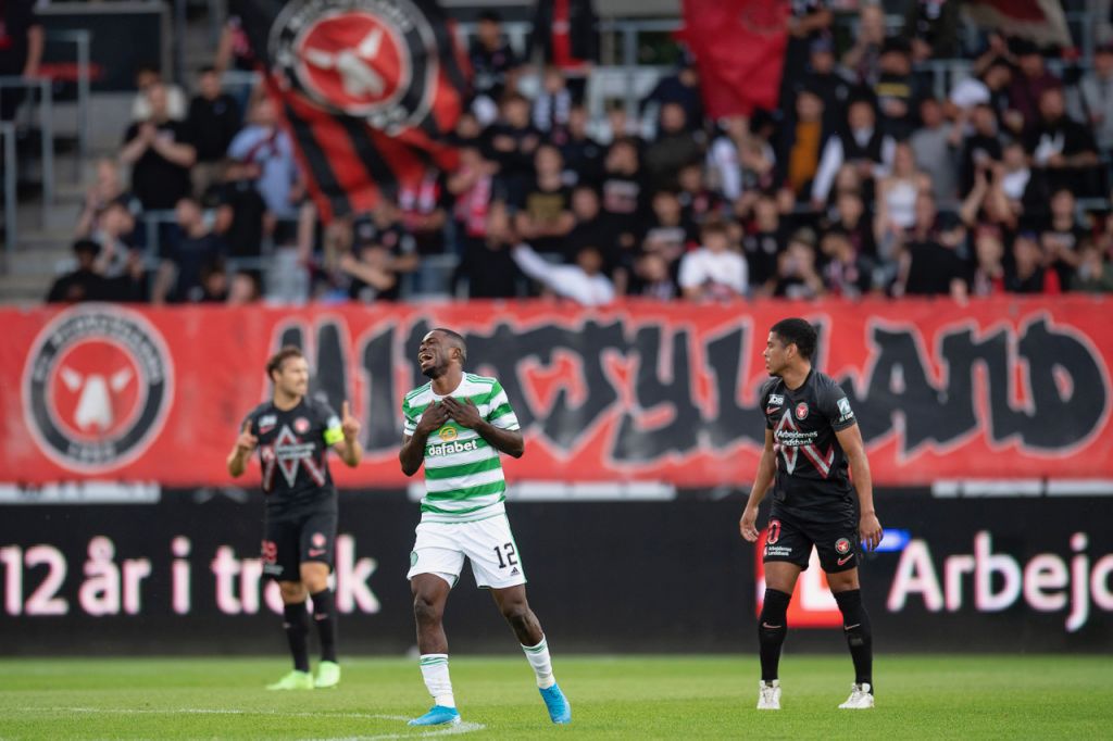 Ismaila Soro between Erik Sviatchenko and Evander Ferreira in the Champions League qualifier between FC Midtjylland and Celtic FC at MCH Arena in Herning, Wednesday 28 July 2021, Herning Denmark. Photo Bo Amstrup