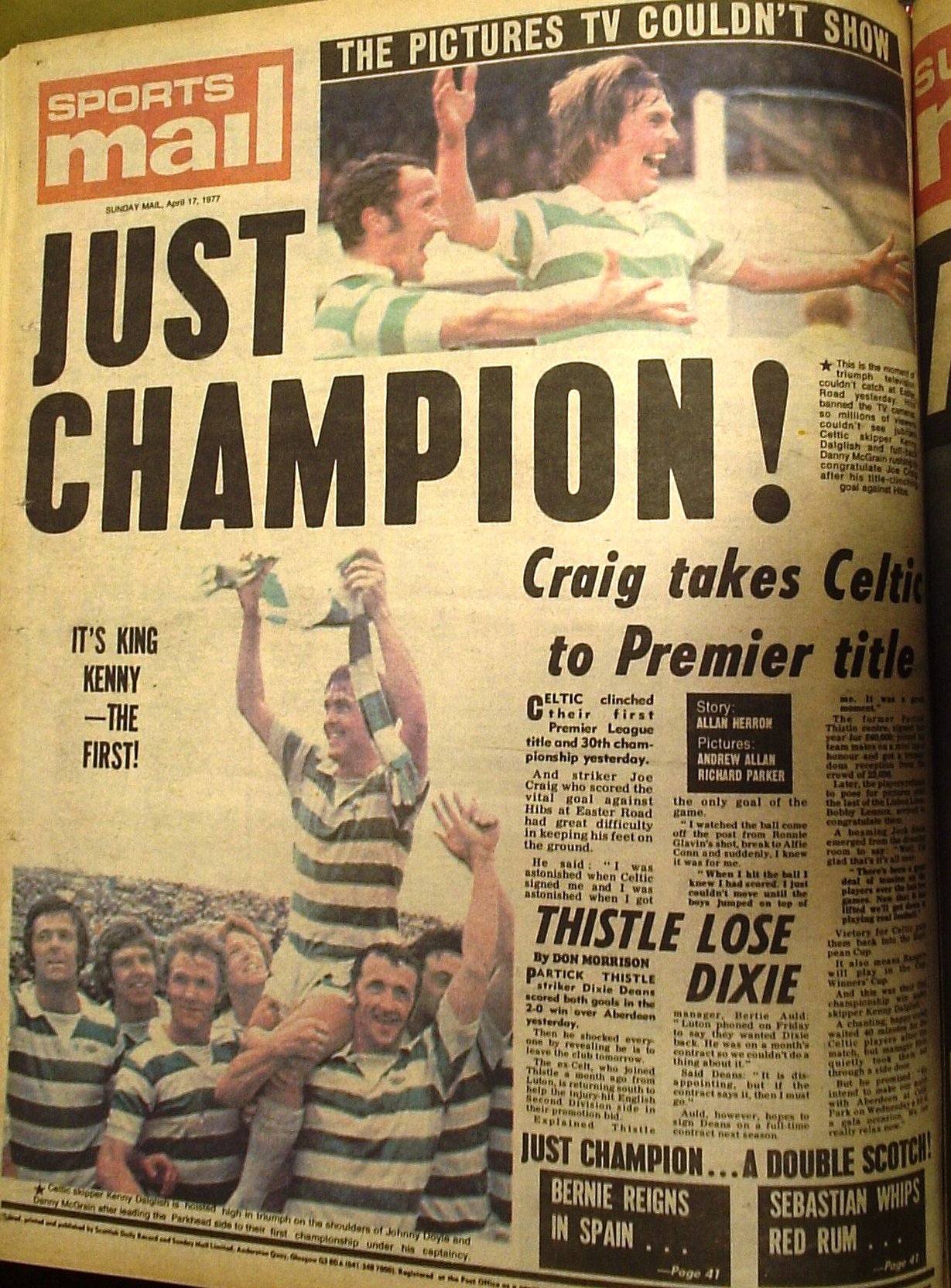 1977 Easter Road, Edinburgh, 16 April. Hibs 0 Celtic 1. A churlish and spiteful Hibs Board refused to allow TV cameras in to this game, but Joe Craig’s goal was enough to land Celtic’s 30th Championship.
