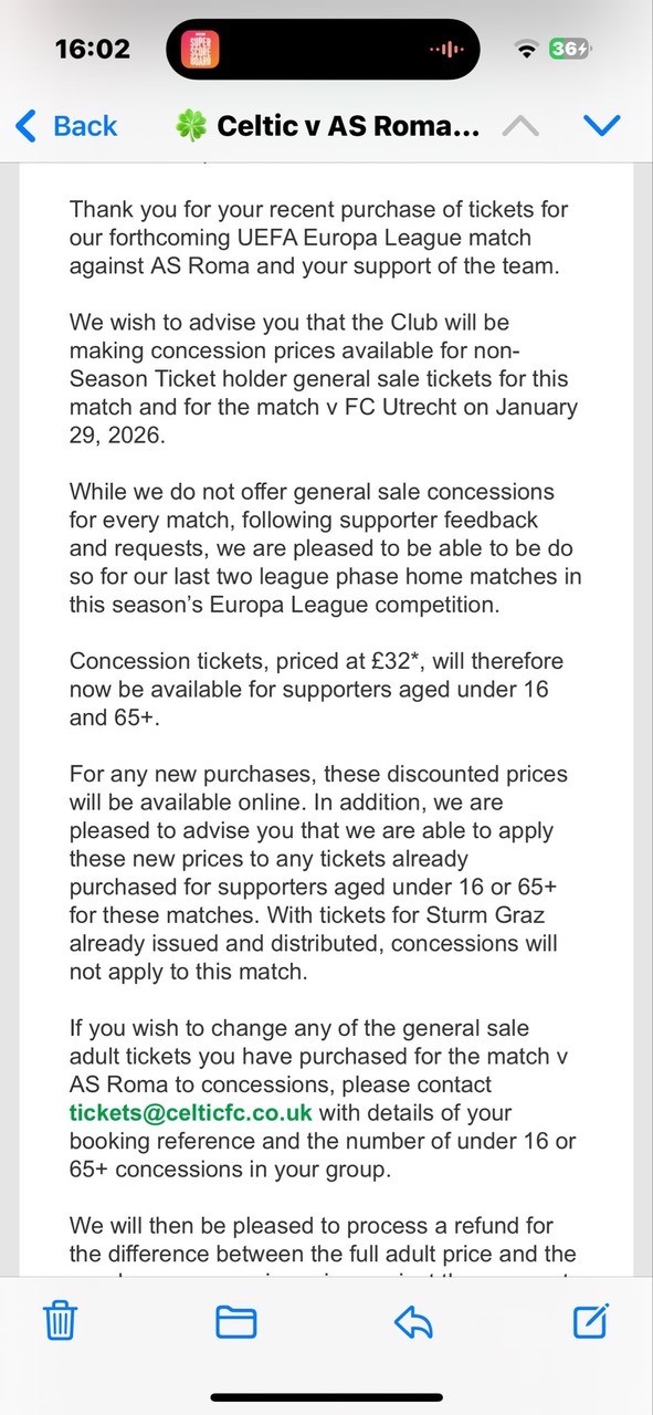 As the concession prices will apply to the game against Roma (but not unfortunately Sturm Graz) the fan who purchased Roma tickets has been offered a refund to lower his tickets to the concession rates and that will apply across the board for U16s and over 65s.