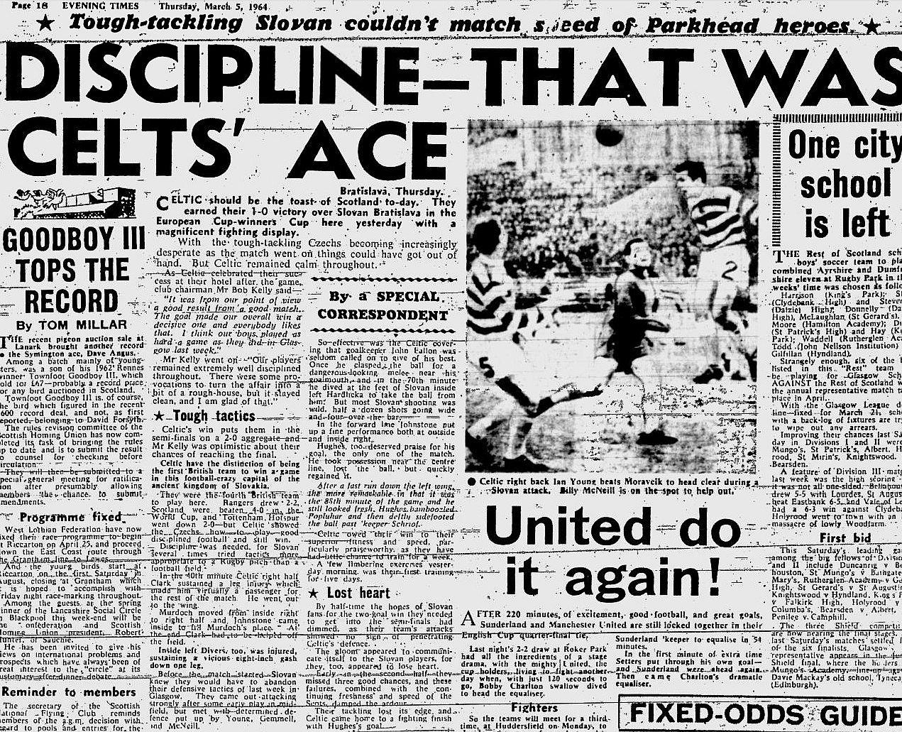 The next season would see Slovan Bratislava meet Celtic for the first time. The first round of the 1963/64 European Cup Winners’ Cup saw both sides record double-digit aggregate wins, Celts beating Basel 10-1 whilst Slovan added another two as they eliminated Finland’s HPS Helsinki 12-2, eight of those goals scored in Bratislava.