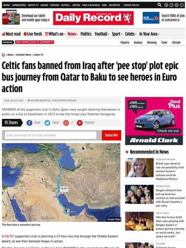 It was not long before the Daily Record removed all trace of the story. The bus broke down during pick-ups outside William Hill on Al Sadd Road and went to Baku by plane, a very straight-forward 2 hour, 45 minute flight for a nervy 0-0 to see Ronny Deila’s Celtic team go through to the next round.