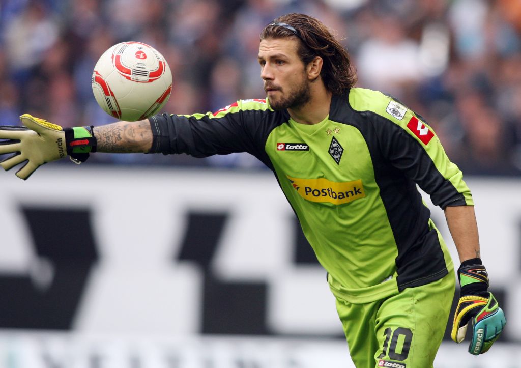 Moenchengladbach’s Belgian goalkeeper Logan Bailly throws the ball during the German first division Bundesliga football match FC Schalke 04 vs Borussia Moenchengladbach in the western German city of Gelsenkirchen on September 25, 2010.  (Photo PATRIK STOLLARZ/AFP via Getty Images)