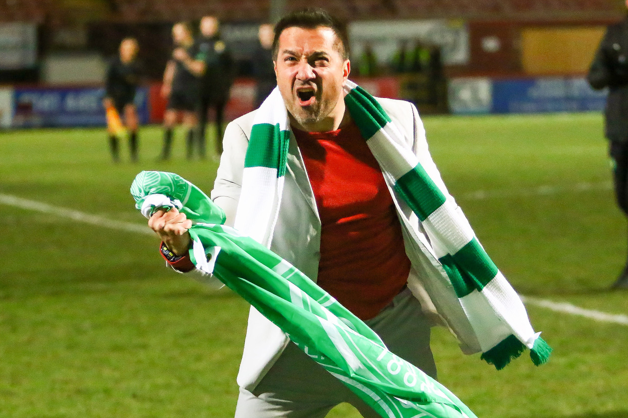 Celtic FC Manager, Fran Alonso punches the air in delight following his sides 1-0 victory during the Scottish Womens Premier League Cup Final match between Glasgow City FC & Celtic FC at Firhill Stadium, Maryhill, Scotland on 5 December 2021.