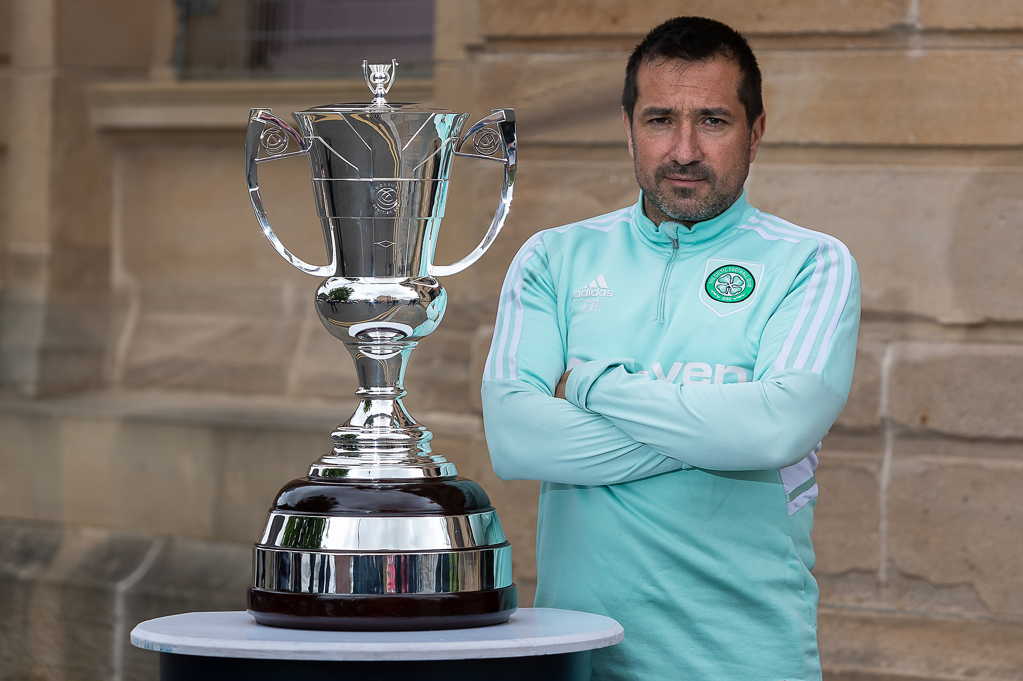 Celtic FC Manager, Fran Alonso stands alongside the Womens Scottish Cup during the Scottish Women’s Cup Press Conference at Glasgow Women’s Library, Glasgow, Scotland on 24 May 2023.