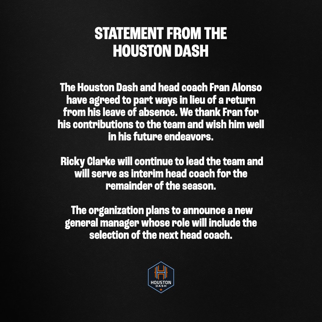 “The Houston Dash and head coach Fran Alonso have agreed to part ways in lieu of a return from his leave of absence. We thank Fran for his contributions to the team and wish him well in his future endeavours.” the short statement reads.