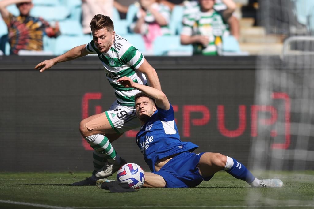 James Forrest of Celtic FC competes for the ball with Vitaliy Mykolenko of Everton FC during the Sydney Super Cup match between Celtic and Everton at Accor Stadium on November 20, 2022 in Sydney, Australia. (Photo by Scott Gardiner/Getty Images)