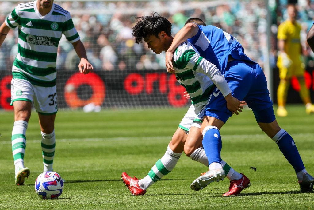 Reo Hatate  is tackled by Evertons Neal Maupay (R) during the Sydney Super Cup football match between Everton and Celtic FC at Stadium Australia in Sydney on November 20, 2022  (Photo by DAVID GRAY/AFP via Getty Images)