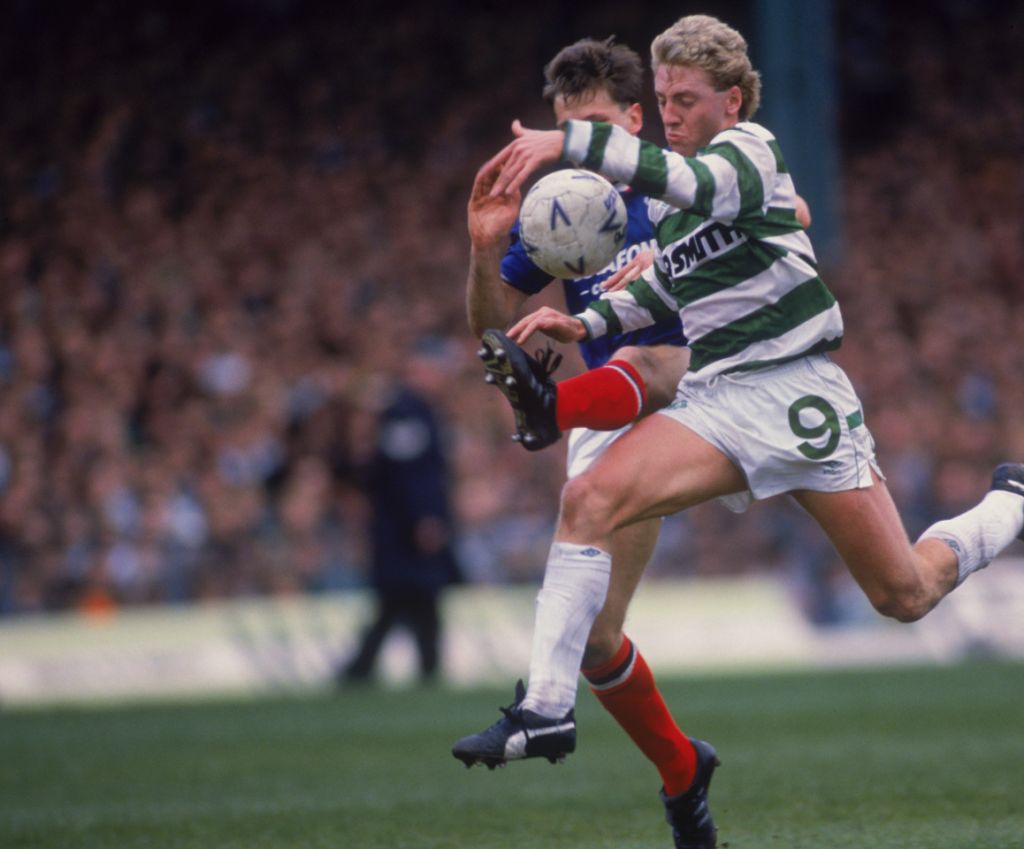 Celtic F.C. striker Frank McAvennie (right) competes for the ball during a Scottish Premier League match against Dundee United at at Celtic Park, Glasgow, 1987. Celtic won the match 3-0. Photo by Simon Bruty/Getty Images