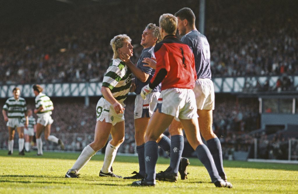 Frank McAvennie (left) of Celtic is grabbed by the throat by a Rangers player as Chris Woods and Terry Butcher also of Rangers step in during the Scottish Premier League match at the Ibrox Stadium in Glasgow, Scotland. The Rangers player wassent off as Rangers and Celtic drew the match 2-2 Photo: Chris Cole/Allsport
