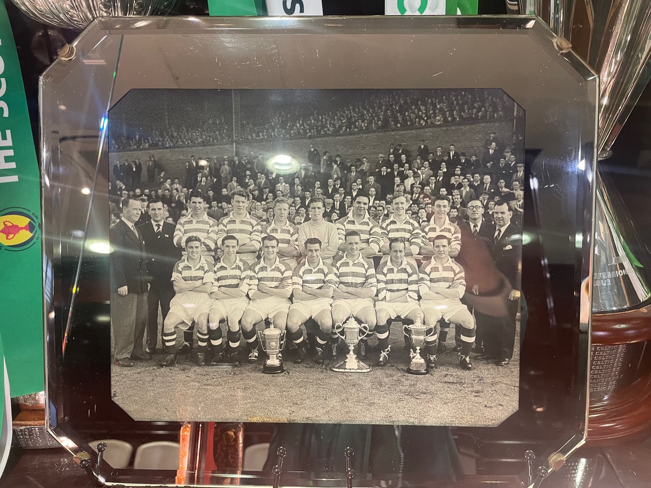 Jimmy McGrory’s wonderful Celtic team of 1953/54 with the three trophies won in 12 months.