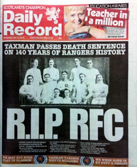 Yet Rangers would have been turning in her grave – you know the one, the grave illustrated on the front page of the Daily Record, The Sun, The Herald, the Scotsman and the rest of them in June 2012, watching what happened that afternoon at her old home.