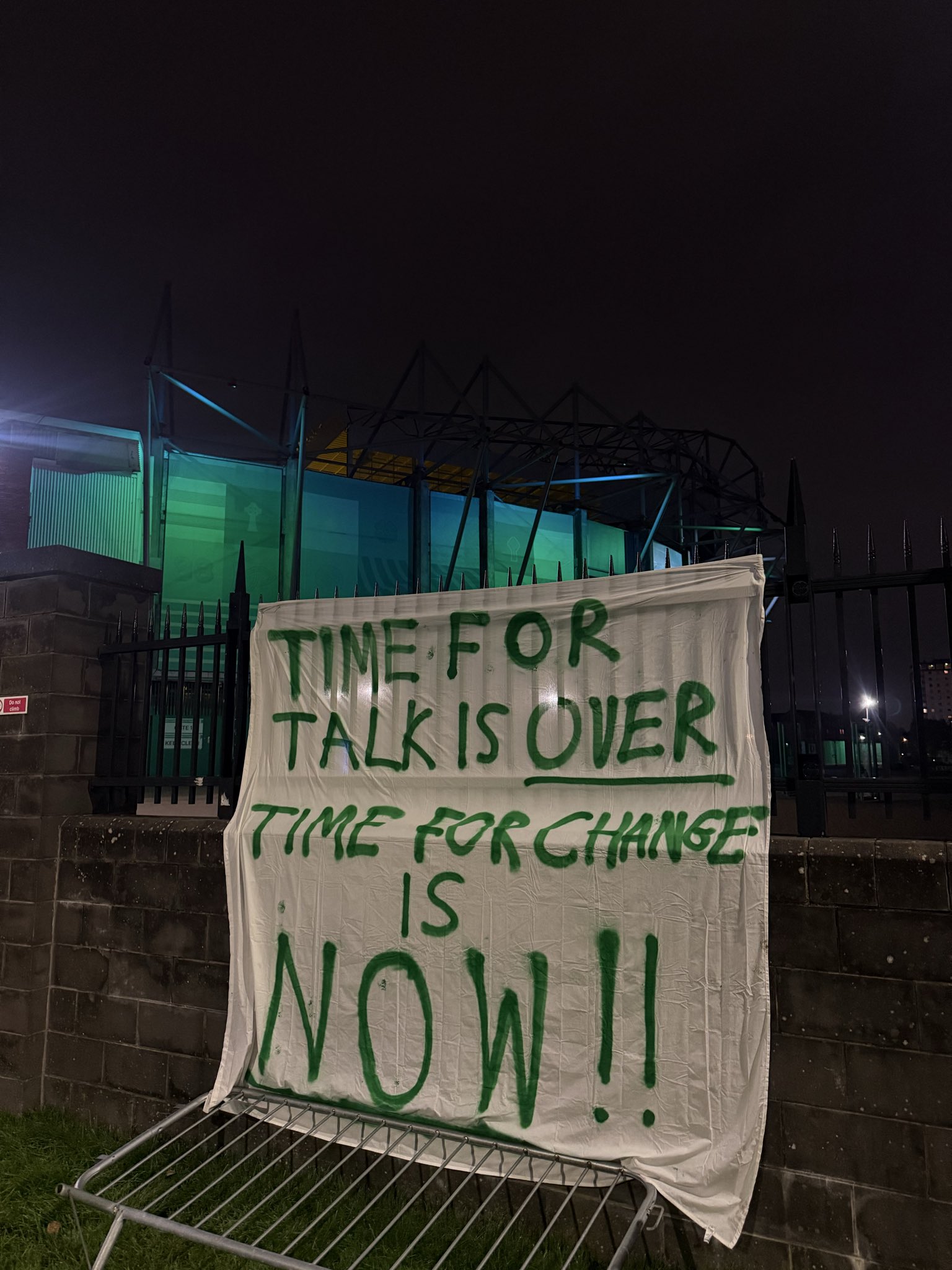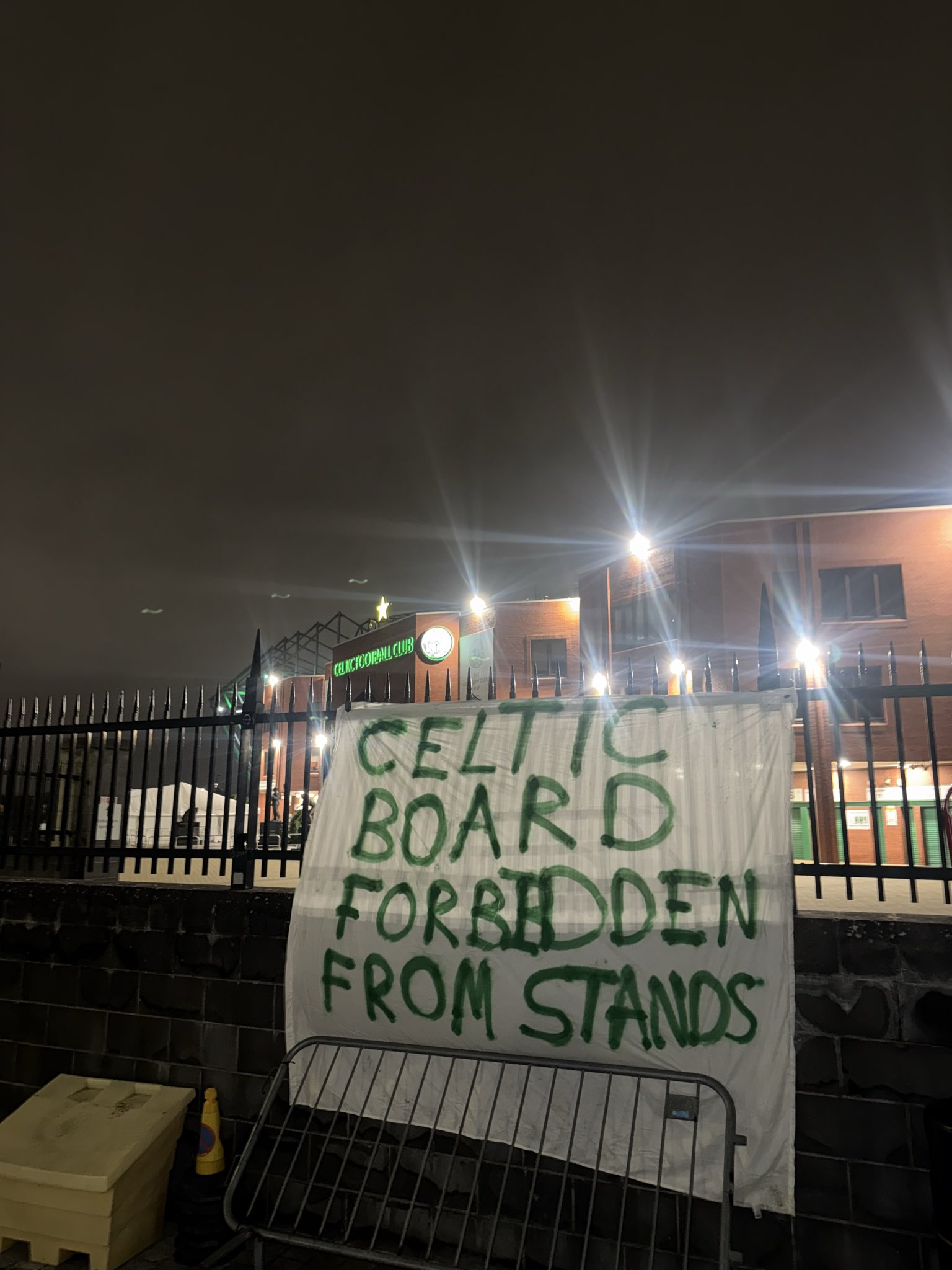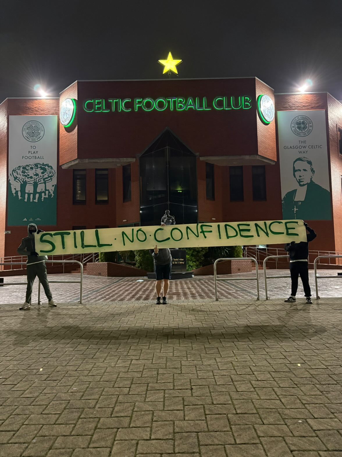 Last night, banners were hung outside the stadium targeting the club’s board and leadership and the messages were pretty unambiguous. “Still no confidence,” “Time for talk is over, time for change is now,” and “Celtic board forbidden from the stands.”