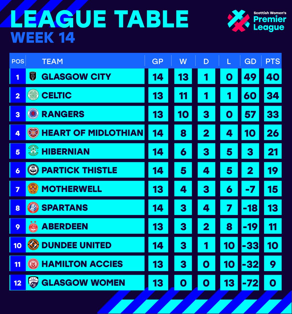 Here’s how the SWPL1 table looks this morning ahead of Celtic FC Women taking on Motherwell in midweek…