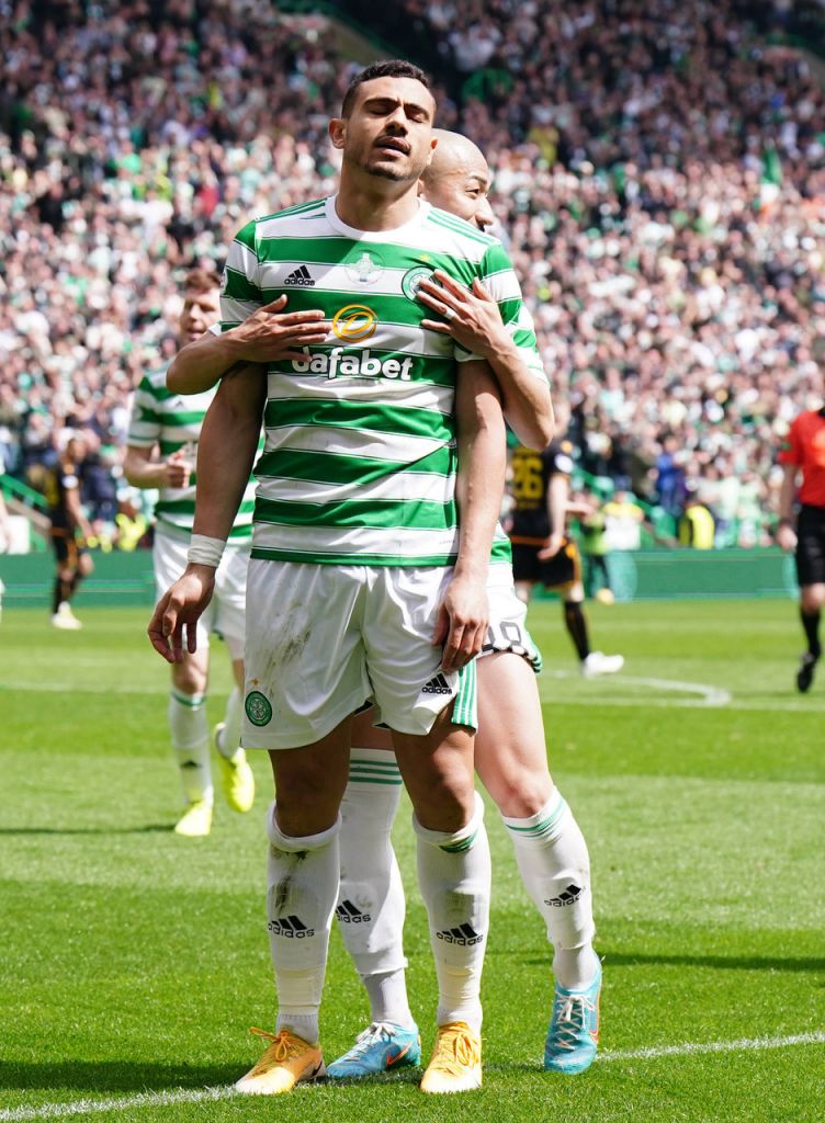 IMAGO / PA Images. Celtic v Motherwell – Giorgos Giakoumakis celebrates scoring his sides fifth goal during the cinch Premiership match at Celtic Park, Saturday May 14, 2022. Photo Jane Barlow