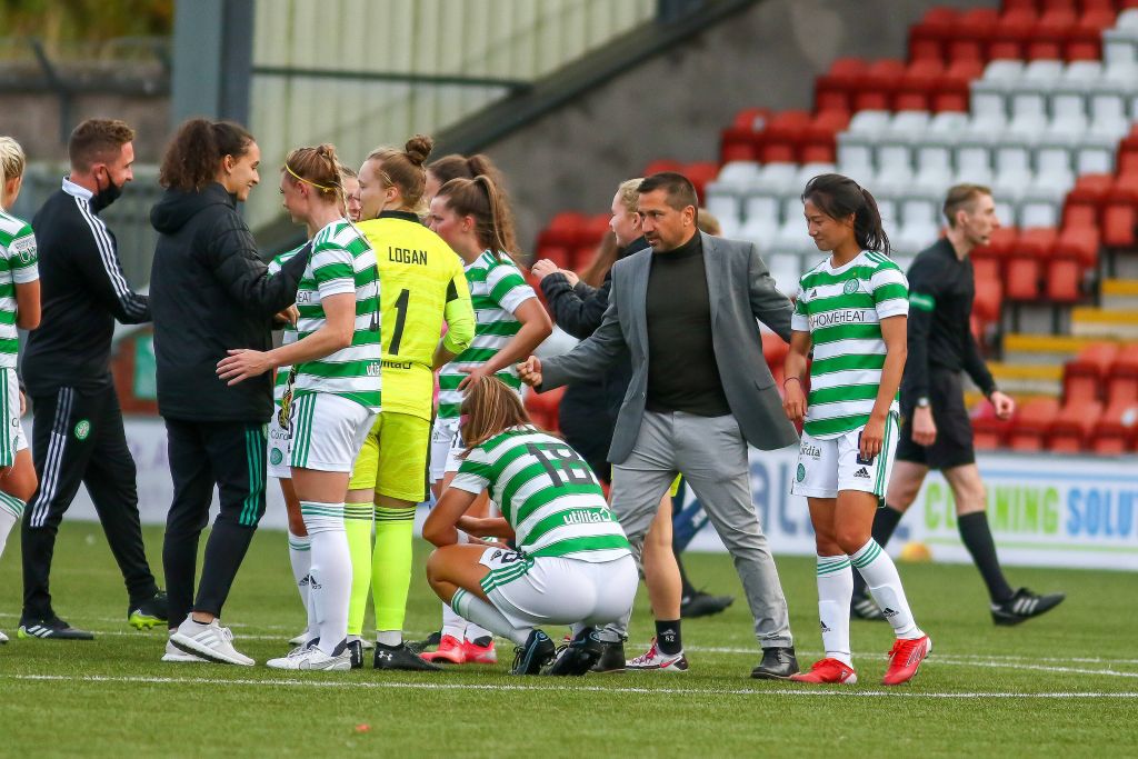 Celtic FC Manager, Fran Alonso congratulates his players after coming back fro 2-0 down to draw 2-2 with Glasgow City .Photo Colin Poultney PSI