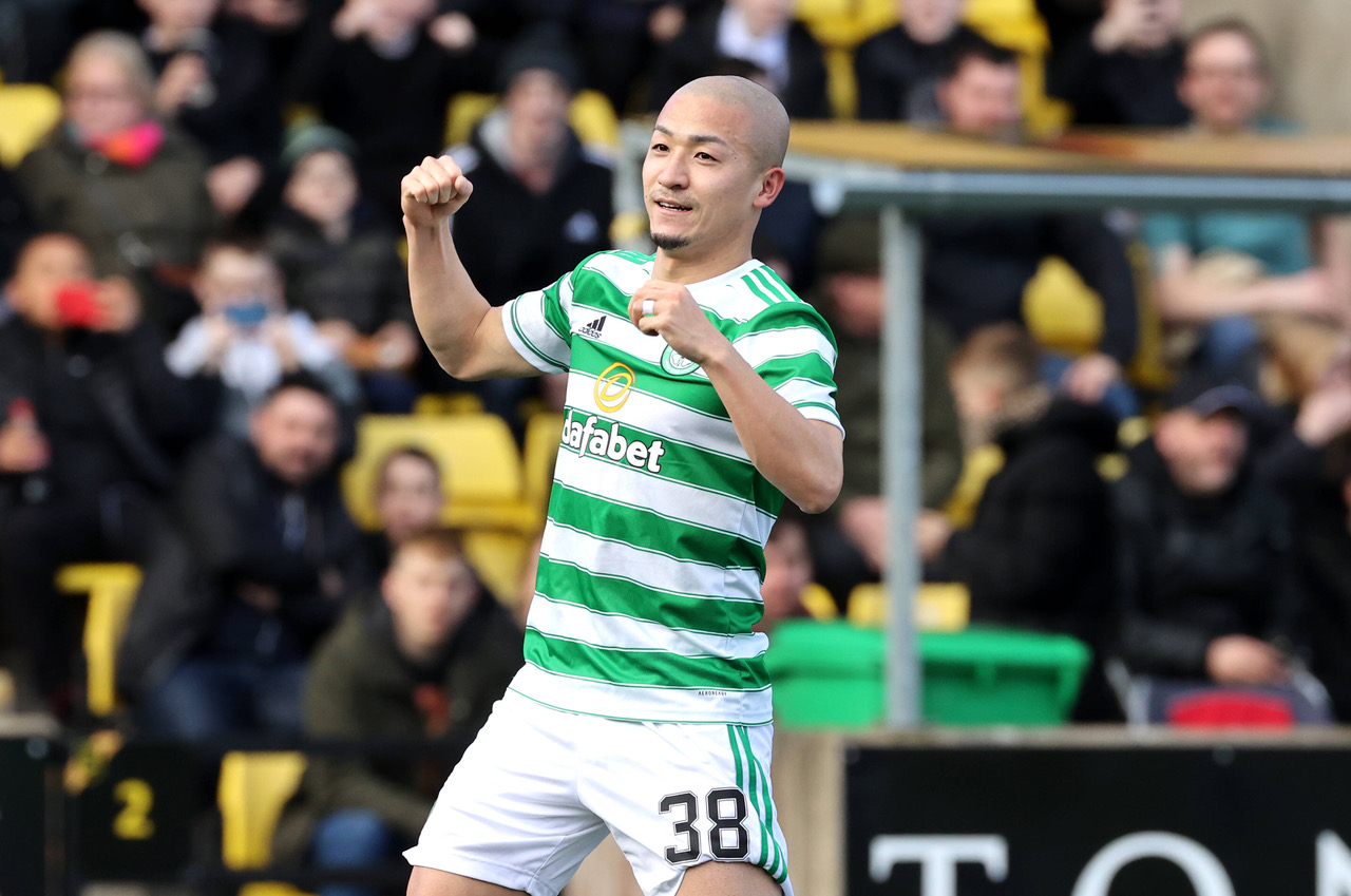 IMAGO / PA Images. Daizen Maeda celebrates scoring Celtic’s first goal of the game during the cinch Premiership match at the Tony Macaroni Arena, Livingston. Sunday March 6, 2022. Photo Steve Welsh