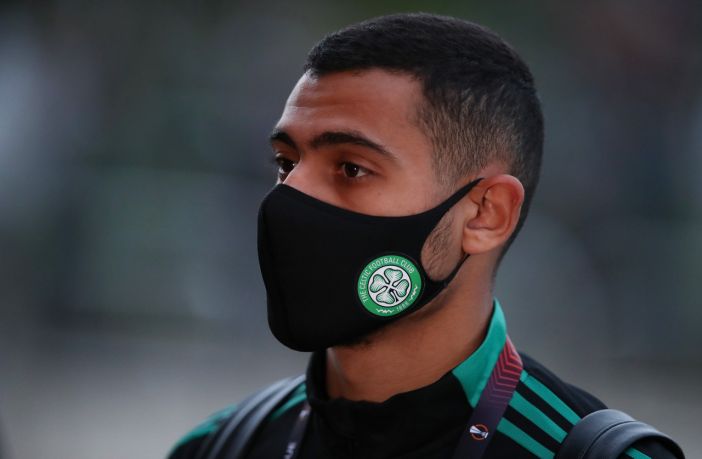 Giorgos Giakoumakis left arrives before the Premier Sports Cup match at Celtic Park, Glasgow. Thursday September 23, 2021. Photo Andrew Milligan