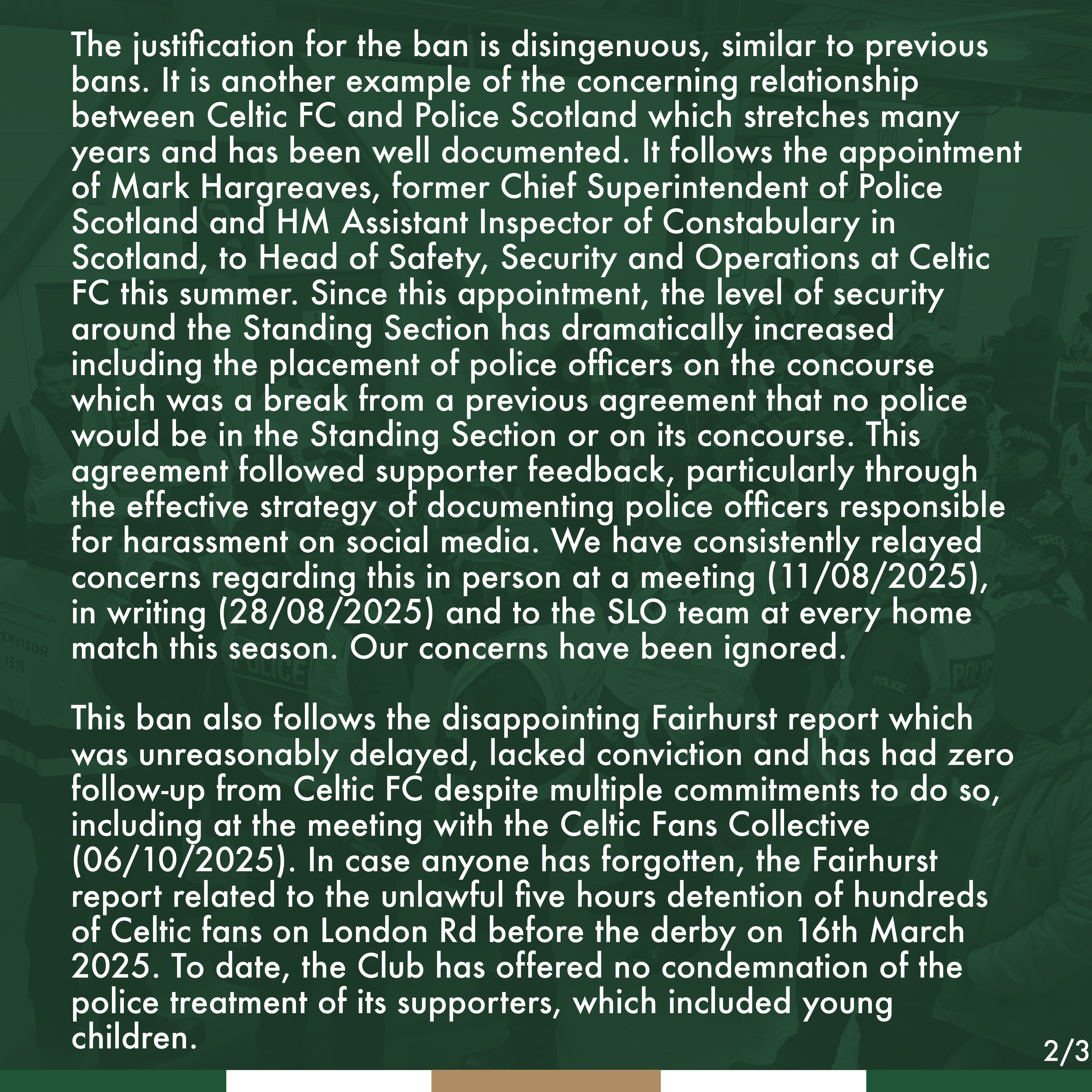 “This ban also follows the disappointing Fairhurst report which was unreasonably delayed, lacked conviction and has had zero follow-up from Celtic FC despite multiple commitments to do so, including at the meeting with the Celtic Fans Collective (06/10/2025). In case anyone has forgotten, the Fairhurst report related to the unlawful five hours detention of hundreds of Celtic fans on London Rd before the derby on 16th March 2025. To date, the Club has offered no condemnation of the police treatment of its supporters, which included young children.”