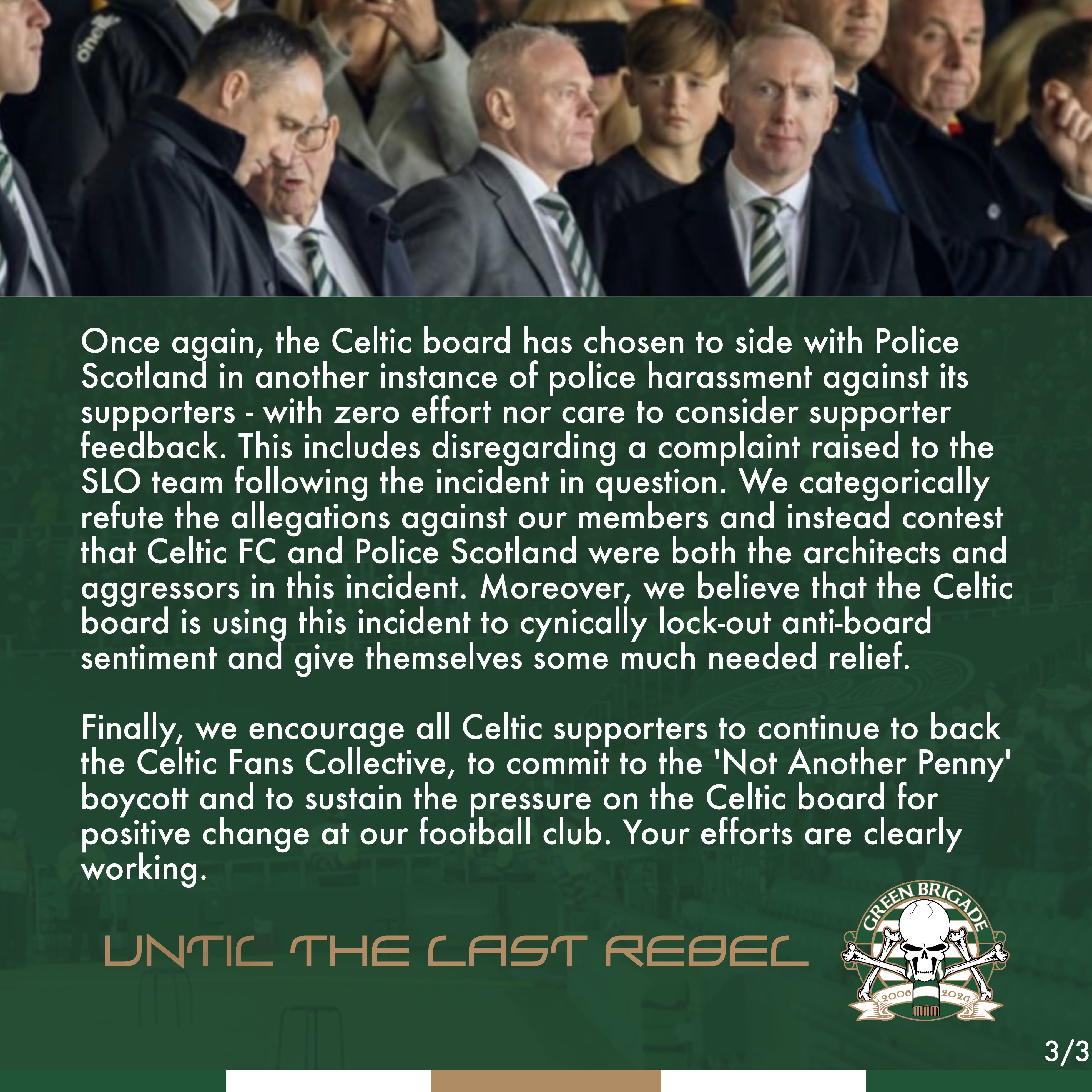 “Finally, we encourage all Celtic supporters to continue to back the Celtic Fans Collective, to commit to the ‘Not Another Penny’ boycott and to sustain the pressure on the Celtic board for positive change at our football club. Your efforts are clearly working.”