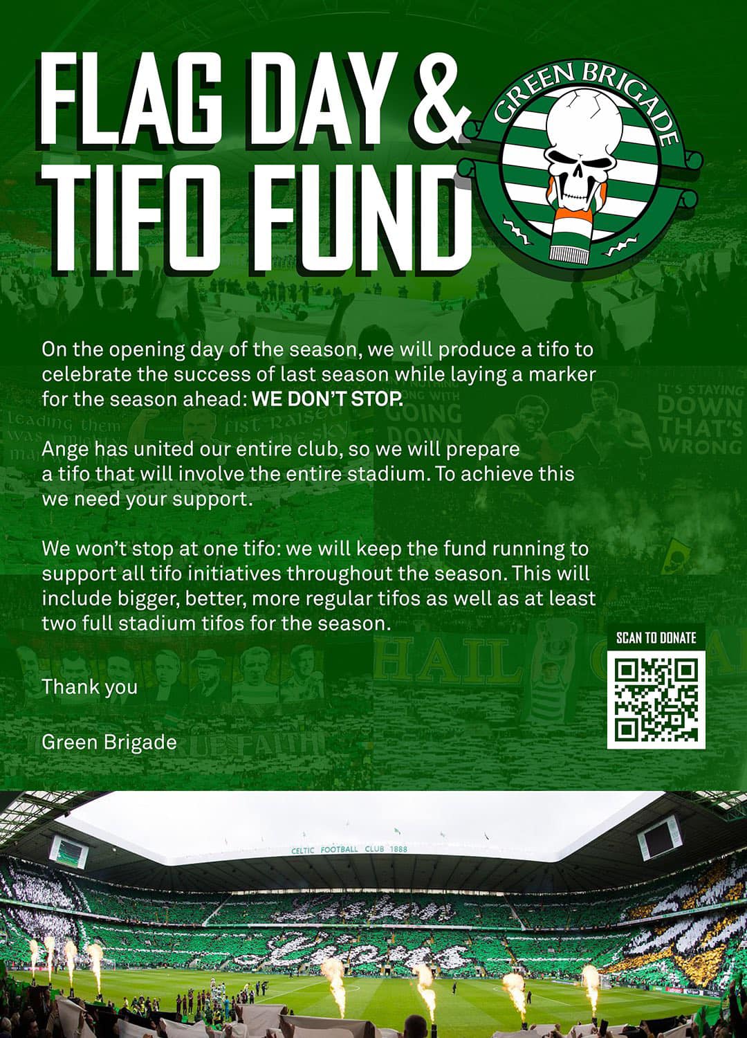 The Green Brigade are looking for Celtic supporters to make a donation to their ambitious season long tifo activity at Paradise which will start with a flag day celebration tifo covering the entire stadium as a tribute to the remarkable success achieved by Ange Postecoglou and his side last season.