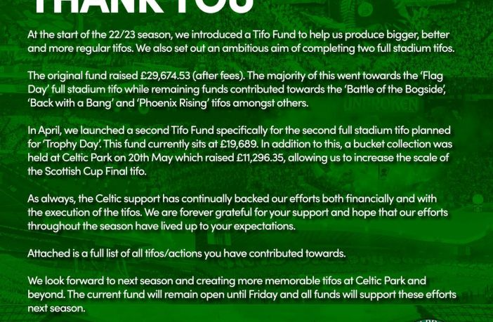 The Green Brigade have released the following statement to show their appreciation to all Celtic supporters for making this season possible with their generosity and will to get involved.
