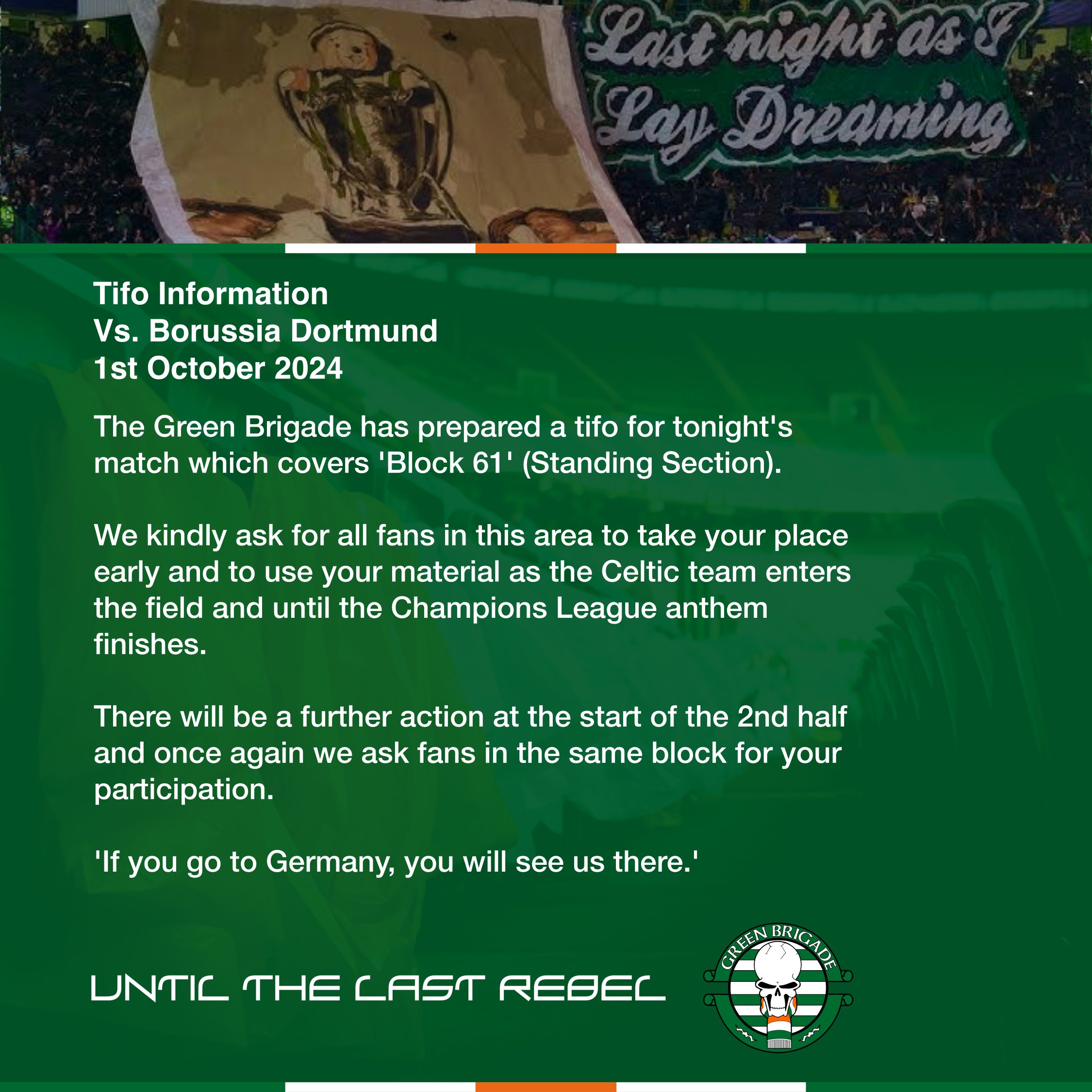 Quoting an appropriate line from a old Celtic classic – “If you go to Germany we will see you there” – the Green Brigade are asking for Celtic supporters to assist in making tonight’s tifo displays look amazing.