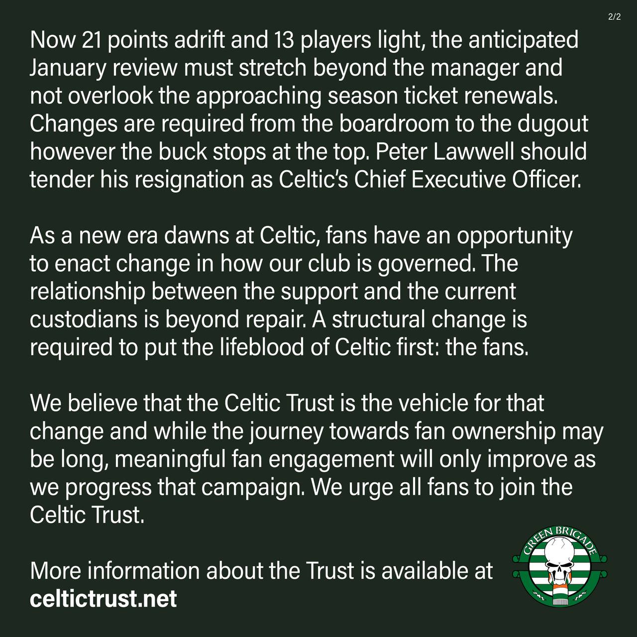 The Green Brigade have this afternoon released a statement in which they call for the resignation of the Celtic CEO Peter Lawwell. They also urge all Celtic Supporters to join the Celtic Trust as a means of securing greater supporter input into the running of the club.