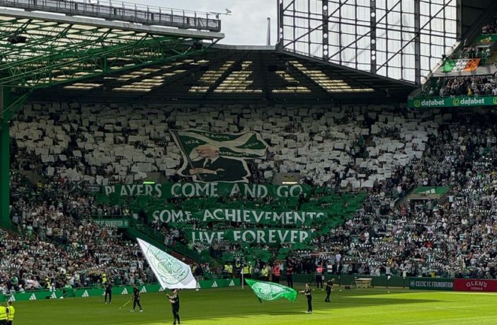 As the players took to their positions, the Green Brigade unveiled their stunning pre-match display, encompassing the full Lisbon Lions Stand – in tribute to the late great John Clark. A minute of applause was then held in tribute to both Clark and John Fallon.