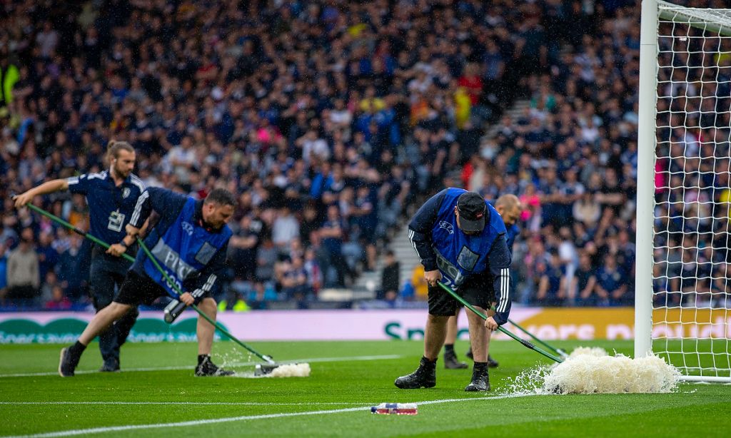 20th June 2023; Hampden Park, Glasgow, Scotland: Euro 2024 Qualifier Football, Scotland versus Georgia; Groundstaff try to clear the pitch