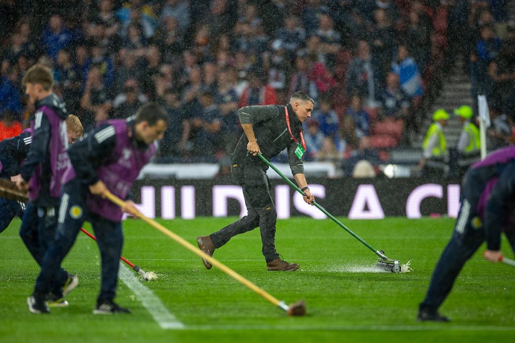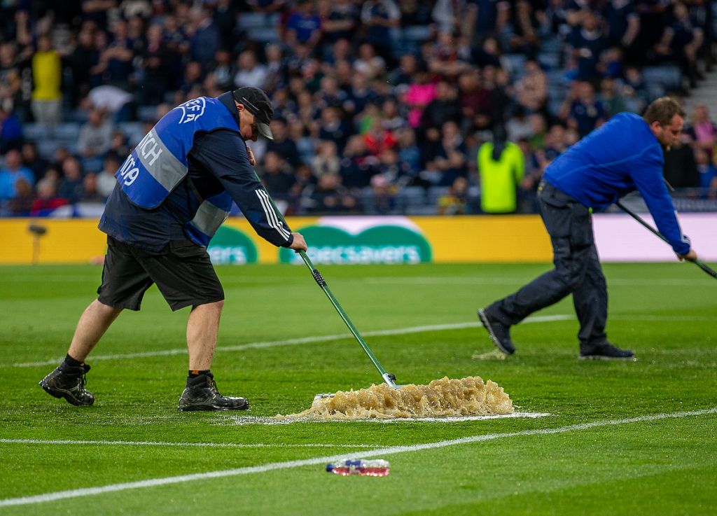 20th June 2023; Hampden Park, Glasgow, Scotland: Euro 2024 Qualifier Football, Scotland versus Georgia; Pitch response ground staff try to clear the water from the pitch
