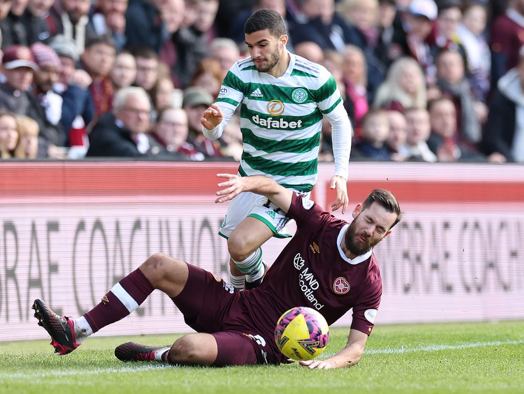 Orestis Kiomourtzoglou of Hearts vies with Liel Abada of Celtic during the Heart of Midlothian v Celtic Scottish Cup match at Tynecastle Stadium on 11 March, 2023. (Photo by Ian MacNicol/Getty Images)