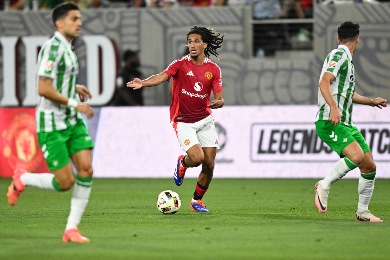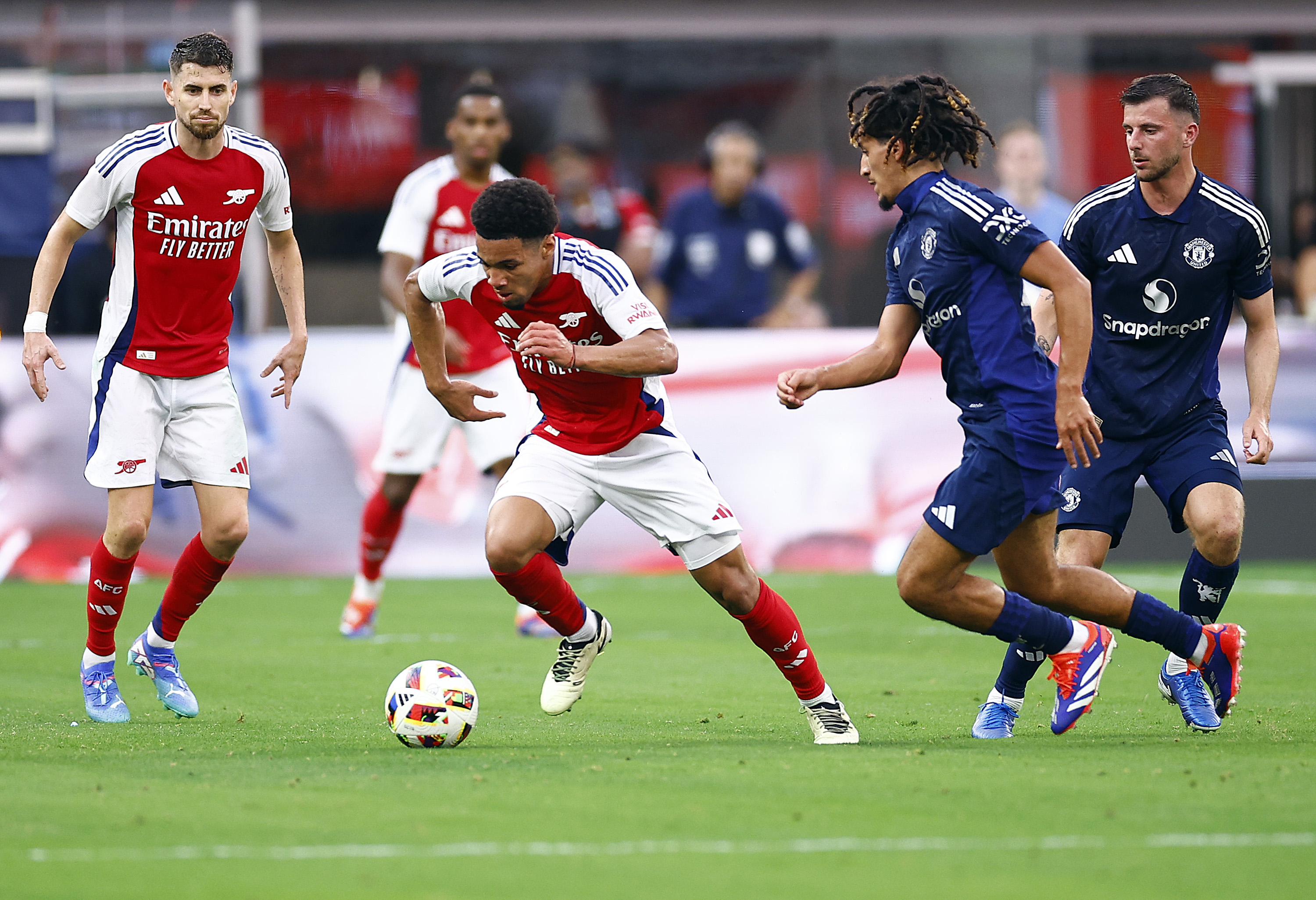 Ethan Nwaneri of Arsenal controls the ball against Hannibal Mejbri of Manchester United during a pre-season friendly match at SoFi Stadium on July 27, 2024 in Inglewood, California. (Photo by Ronald Martinez/Getty Images)