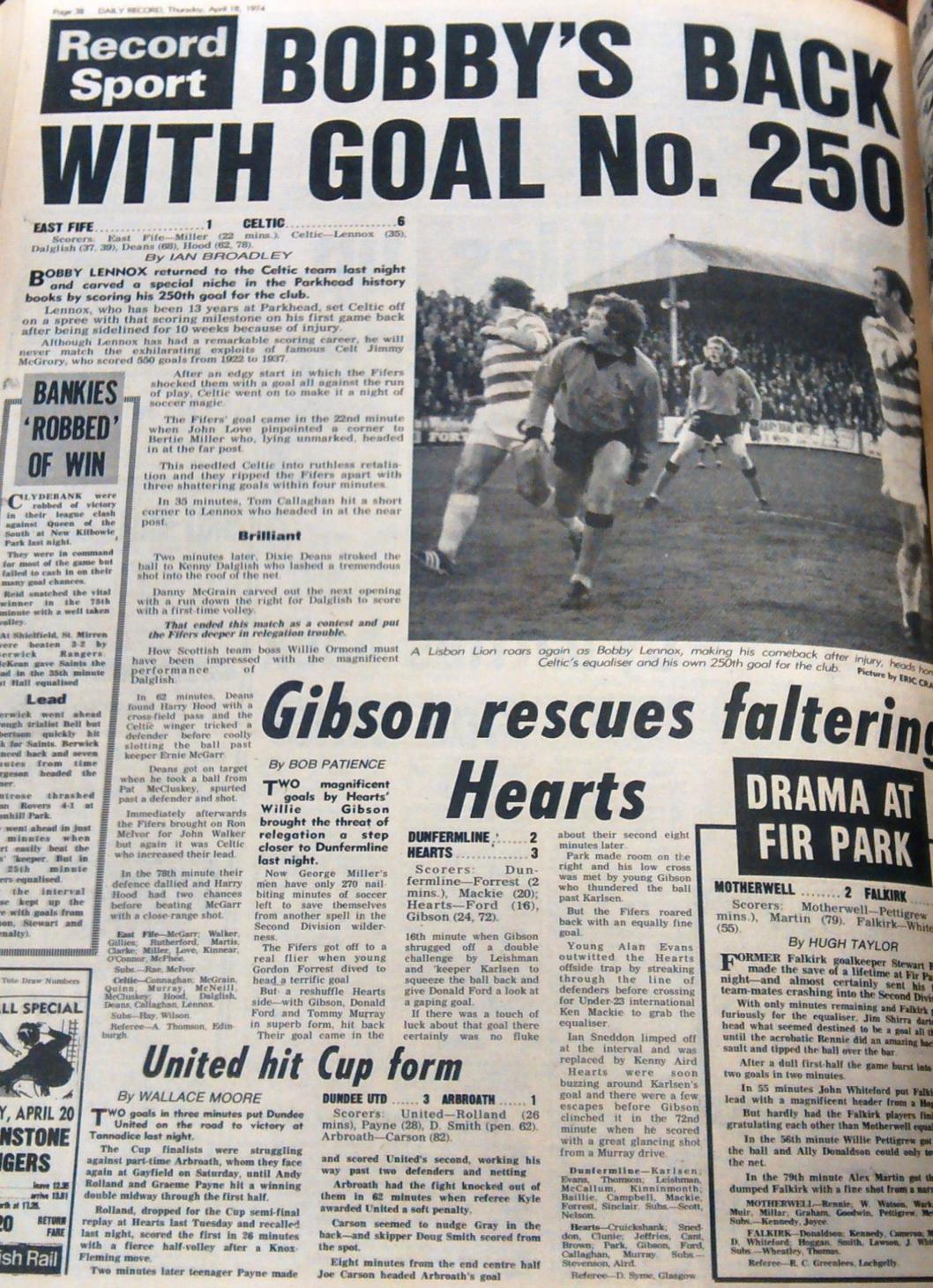 That would continue in midweek in Methil, Jimmy Quinn, Dixie Deans and Bobby Lennox all returning, the Lisbon Lion after a 10-week injury absence, whilst Jim Brogan, Paul Wilson and Jimmy Bone dropped out. There was none of the three missed spot-kicks and last-minute equaliser drama experienced in the previous trip to Bayview, 14 months earlier, albeit Bertie Miller would give East Fife a shock lead midway through the first half. Lennox would level the match with 10 minutes of the first half remaining, his 250th goal of a wonderful Celtic career, Kenny Dalglish then wrapping up the points before the interval with a superb quickfire double. A similar scoring burst midway through the second period saw the Hoops run out emphatic 6-1 winners on the night, Harry Hood grabbing his own brace either side of a Deans strike, to take Celtic within three points of nine-in-a-row.