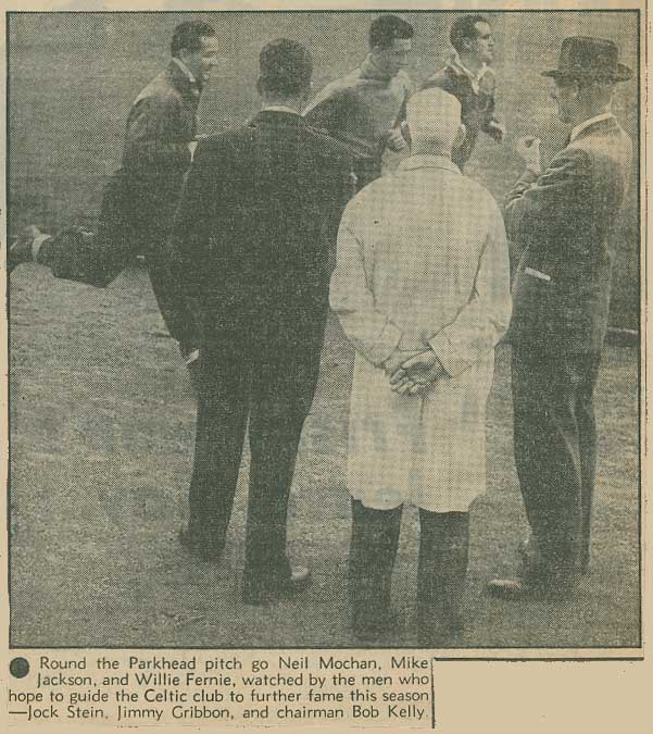 Jimmy and Jock with Bob Kelly observing training at Celtic Park in the late 1950s