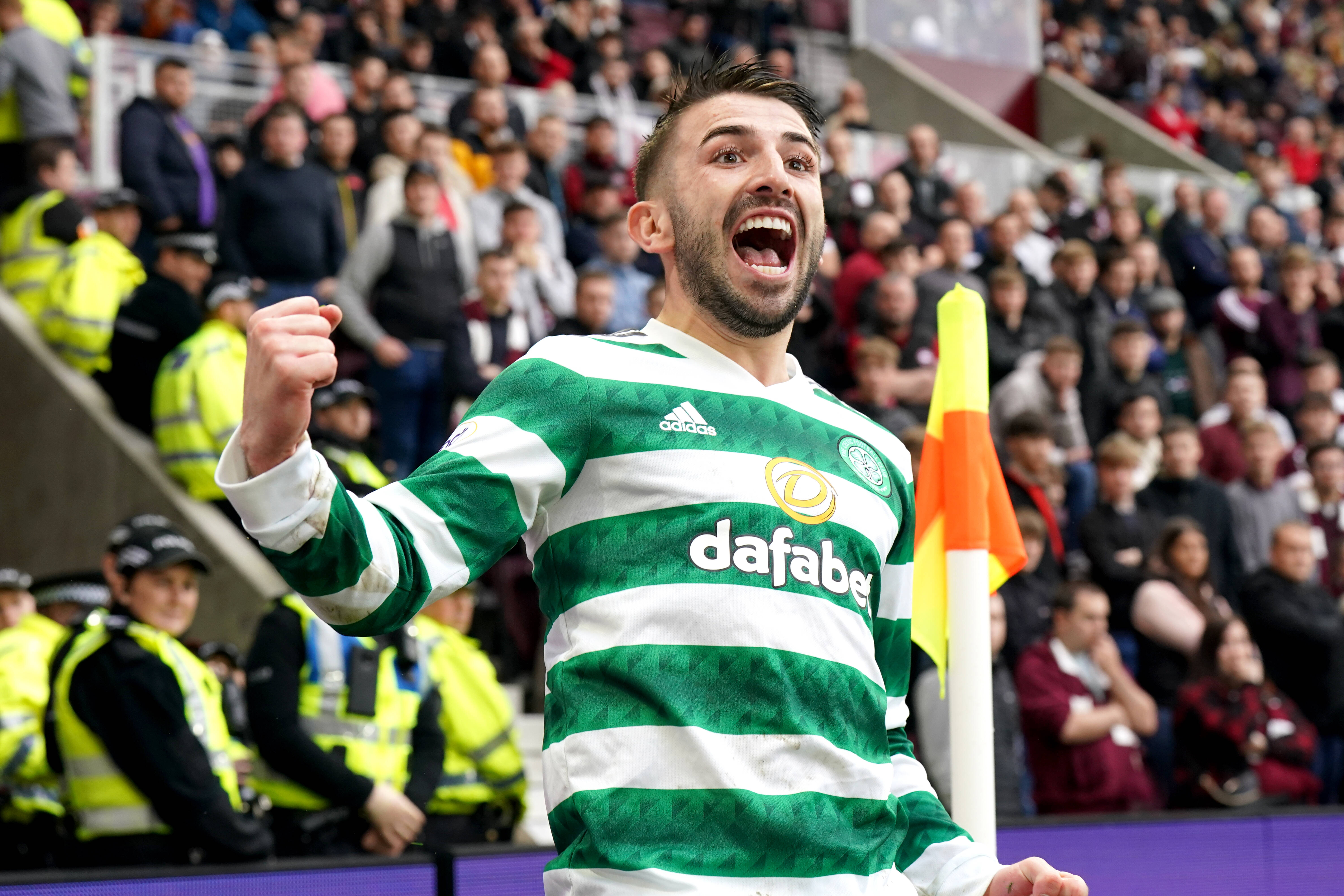 Greg Taylor celebrates scoring the winning goal of the game during the cinch Premiership match at Tynecastle on Saturday October 22, 2022. Photo Jane Barlow