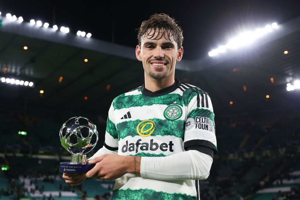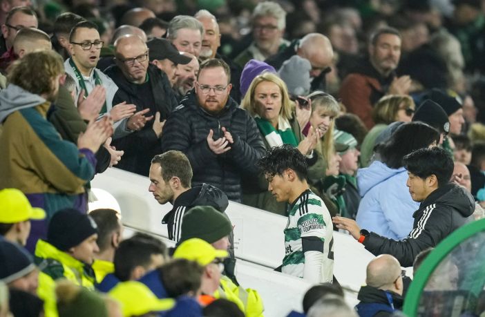 Reo Hatate looks dejected as he leaves the field after sustaining an injury during the UEFA Champions League match between Celtic FC and Atletico Madrid at Celtic Park on October 25, 2023 . (Photo by Ian MacNicol/Getty Images)
