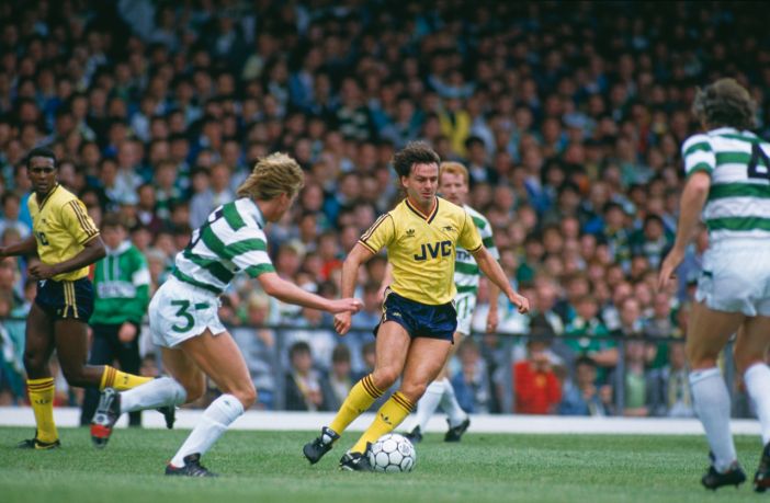 1987: Charlie Nicholas of Arsenal is tackled by Roy Aitken of Celtic during a pre-season Friendly match at Celtic Park. Photo Allsport UK /Allsport