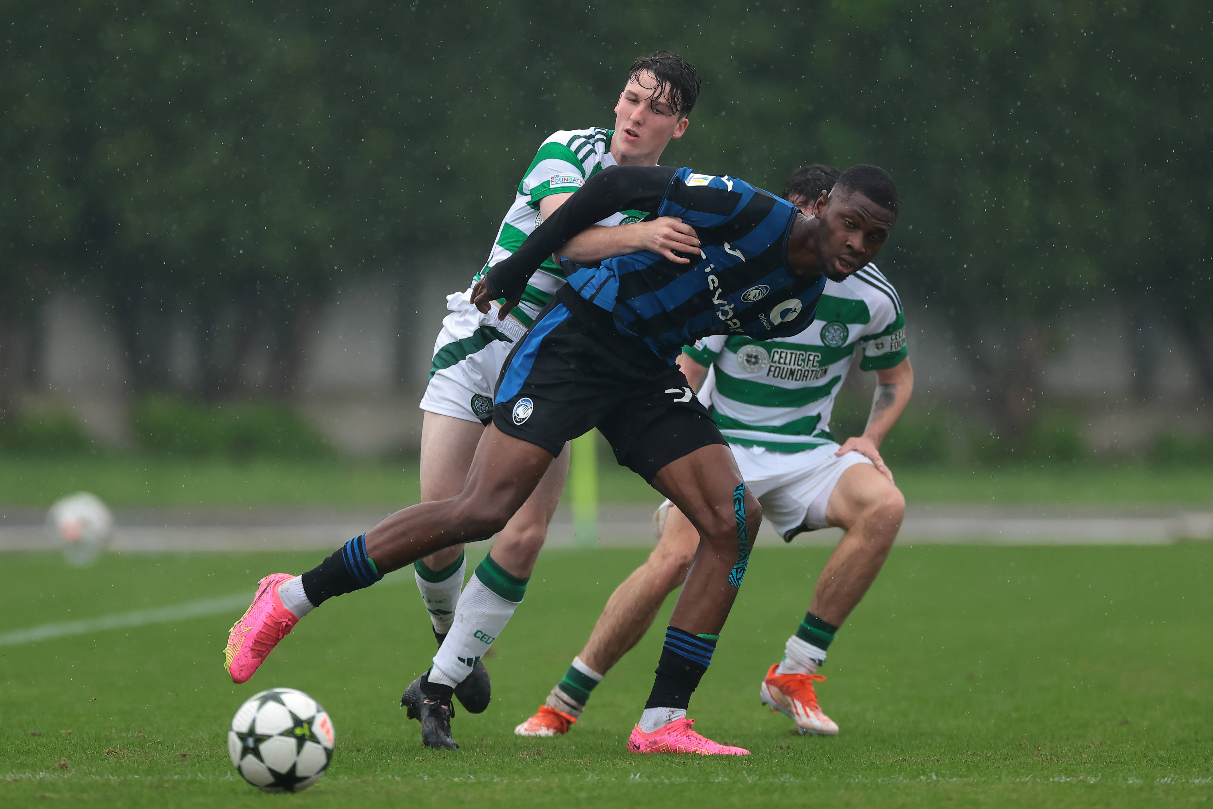 Caravaggio, Italy, 23rd October 2024. Aiden Haddow of Celtic tussles with Henry Camara of Atalanta during the UEFA Youth League match at Stadio Comunale di Caravaggio, Caravaggio. Photo: Jonathan Moscrop / Sportimage
