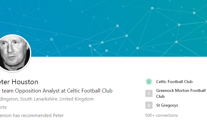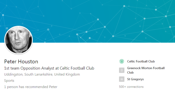 Houston has updated his Linkedin profile to state that his current role is “1st team Opposition Analyst at Celtic Football Club”.