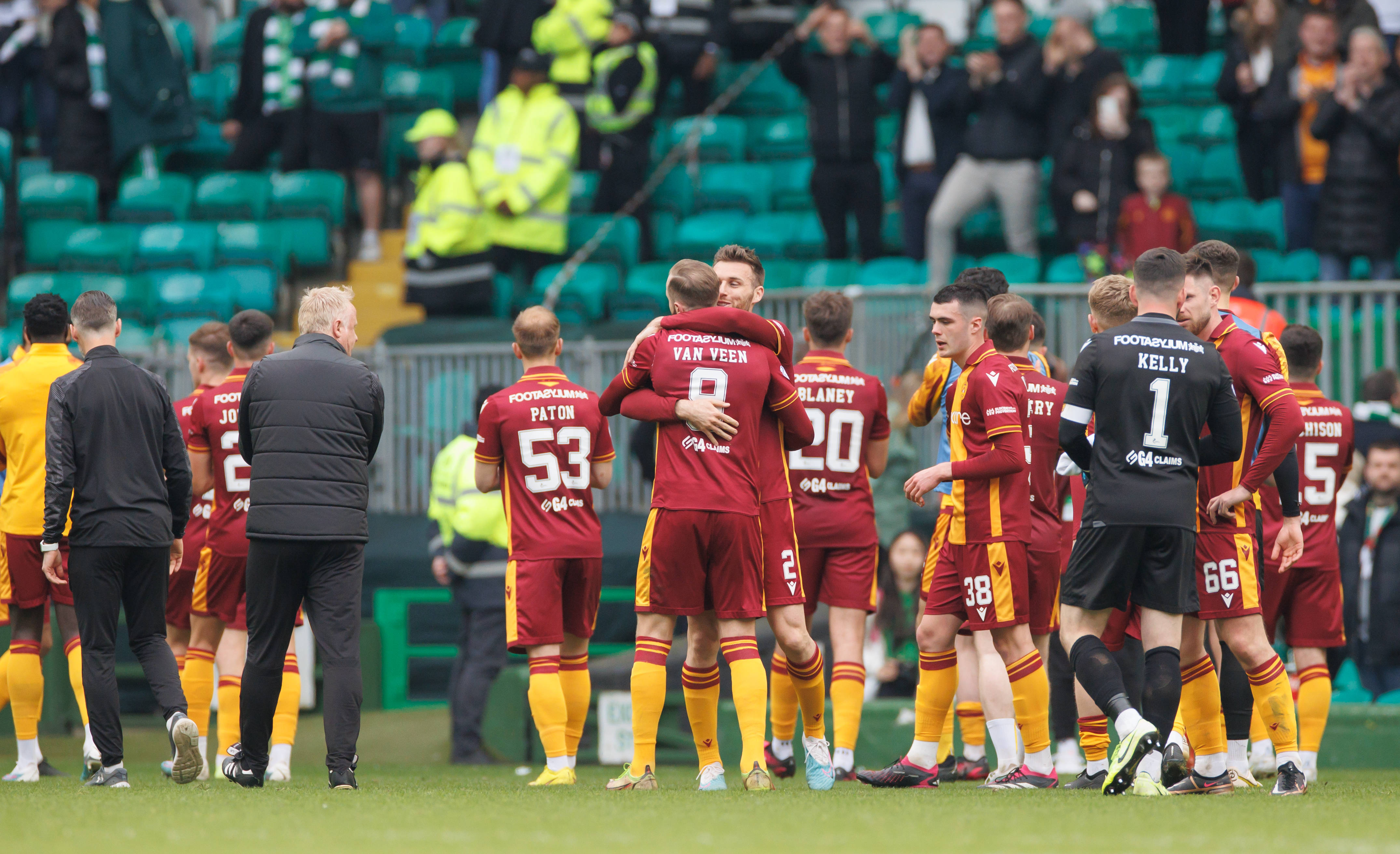 Celtic v Motherwell – Motherwell players celebrate after the cinch Premiership match at Celtic Park: Saturday April 22, 2023. Photo Steve Welsh