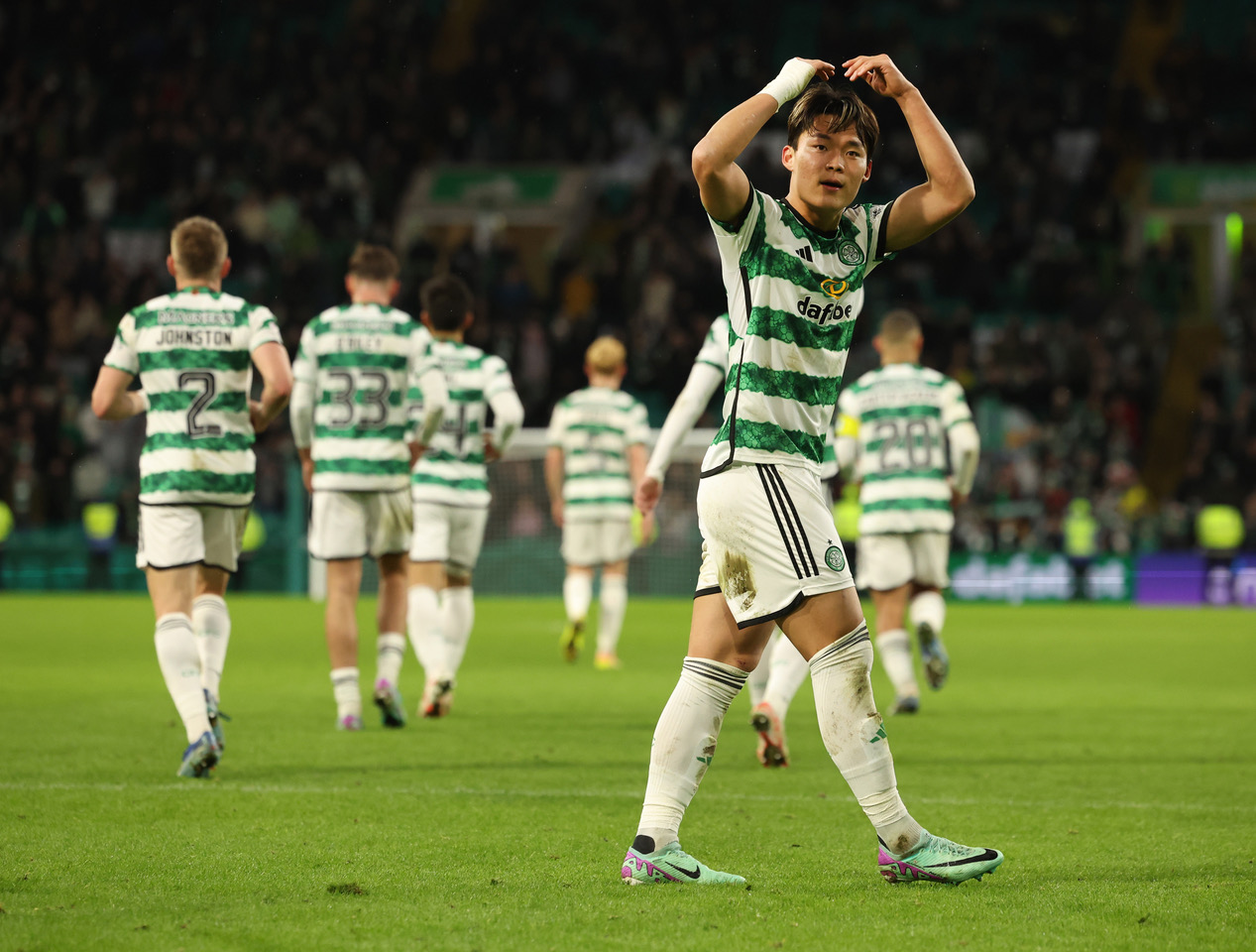 Photo by Robert Perry/Shutterstock -Kyogo Furuhashi of Celtic scores goal. Celtic v Dundee, Cinch Scottish Premiership,  Celtic Park,  – 16 September 2023