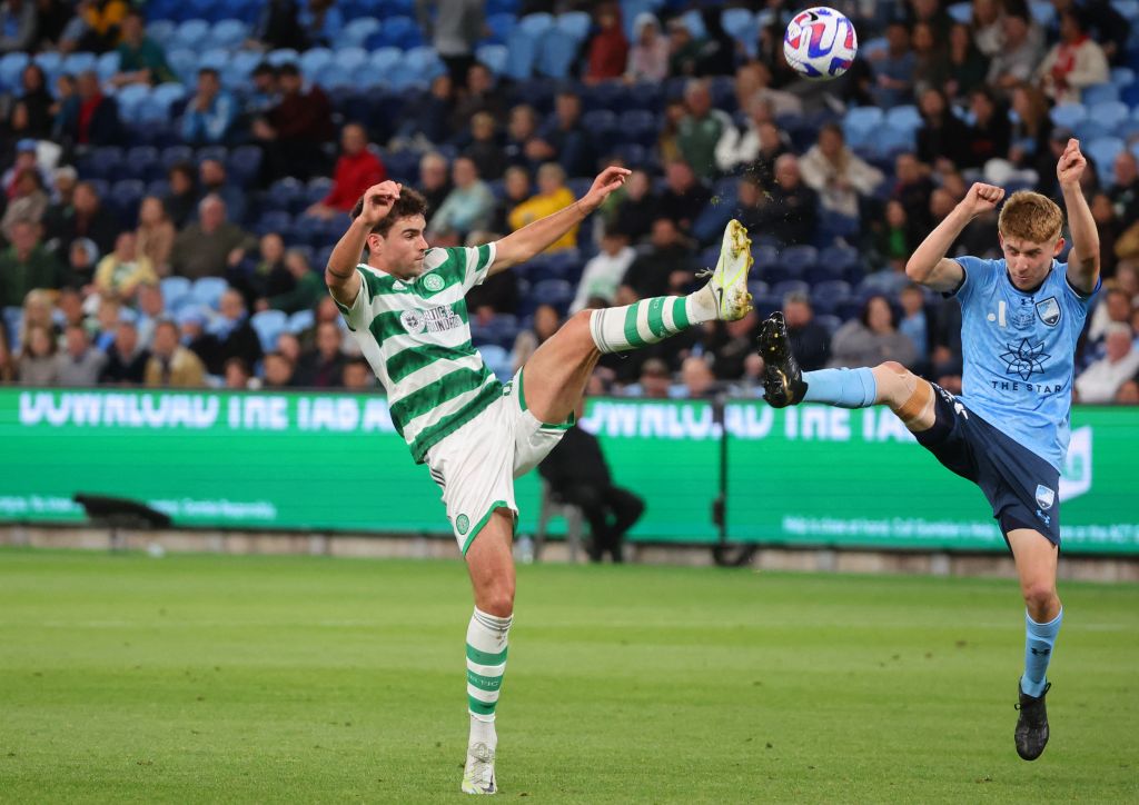 Celtic FC’s Matt O’Riley and Sydney FC’s Jaiden Kucharski fight for the ball during the Sydney Super Cup football match between Celtic FC and Sydney FC at the Allianz Stadium in Sydney on November 17, 2022.