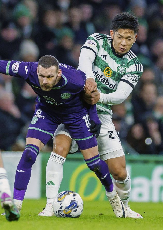 Celtic’s Tomoki Iwata vies for the ball during the Scottish Premiership match against Hibernian in Glasgow, , on 6 December, 2023.