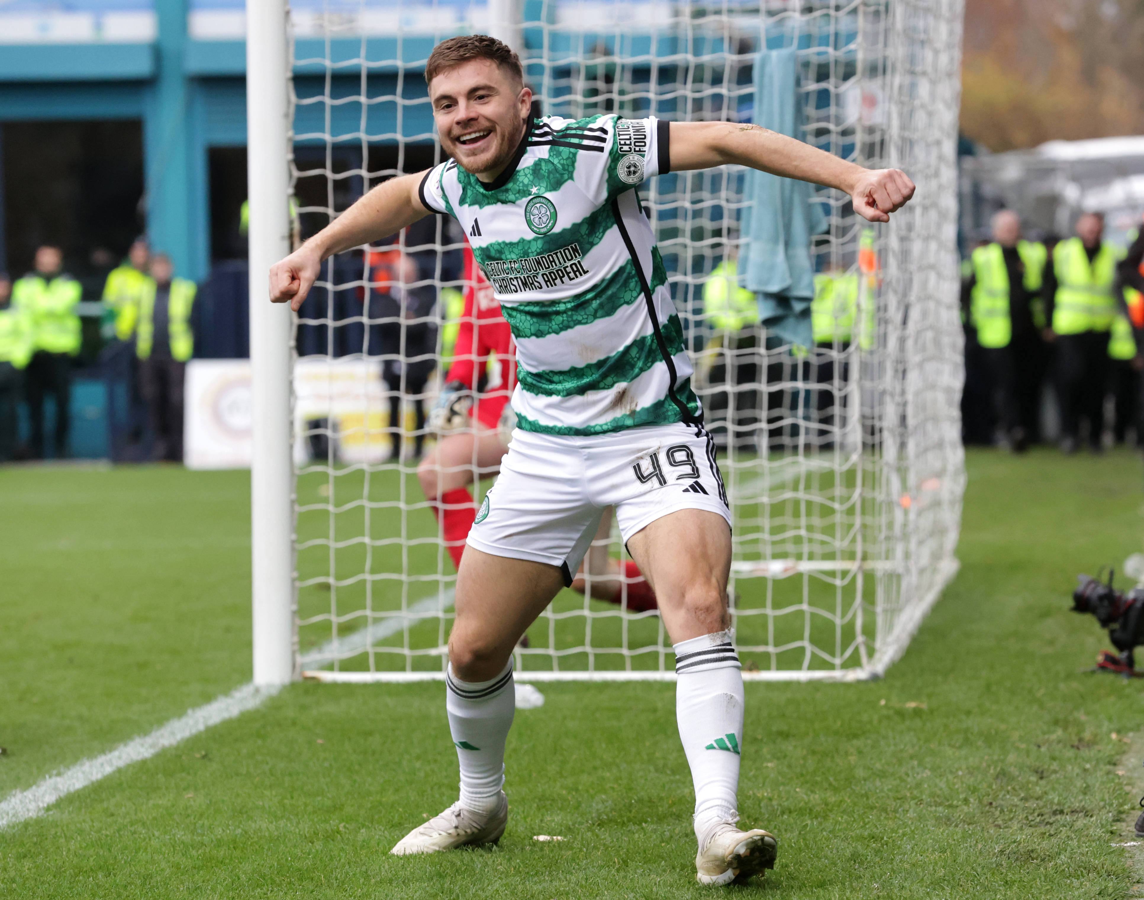 Ross County v Celtic – James Forrest celebrates scoring  during the Premiership match at Dingwall. Saturday November 4, 2023. Photo Steve Welsh